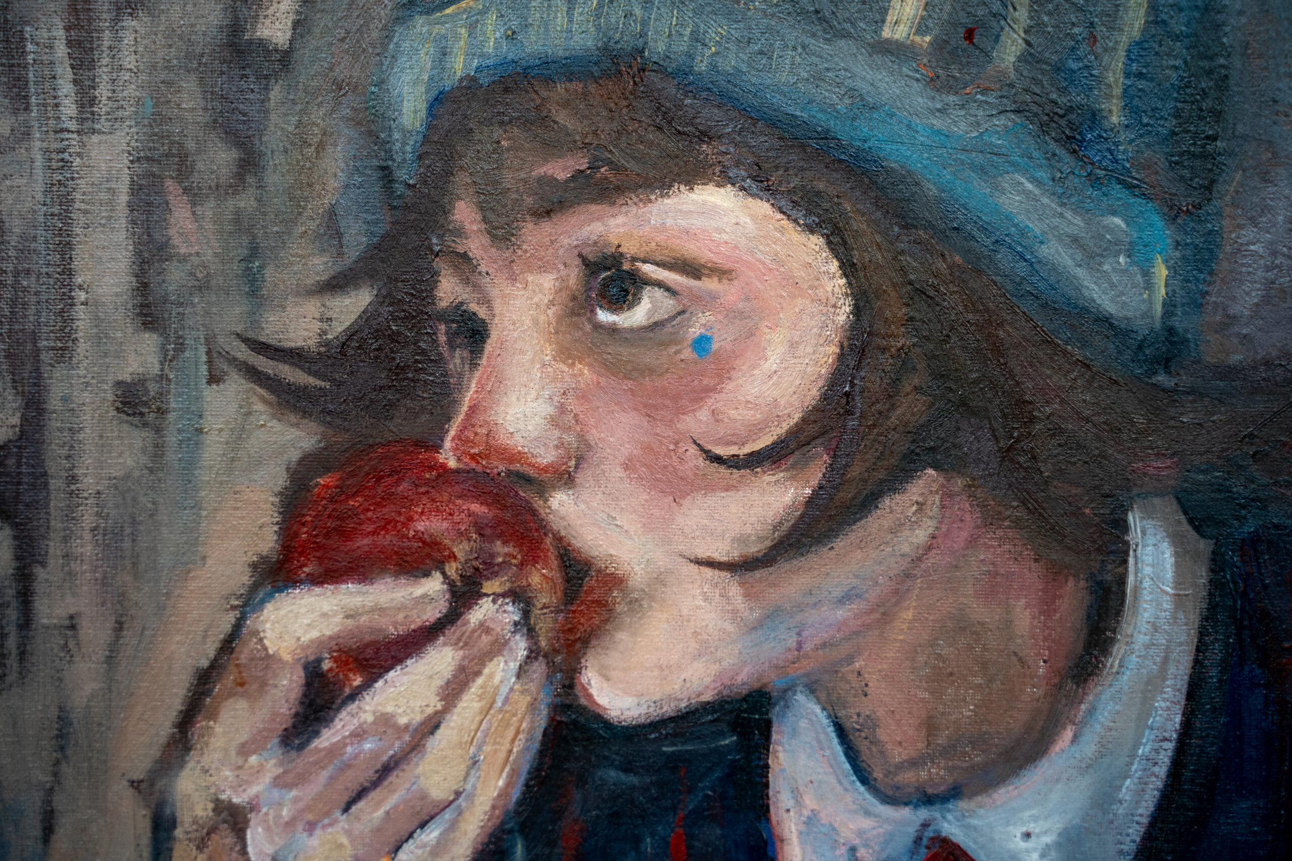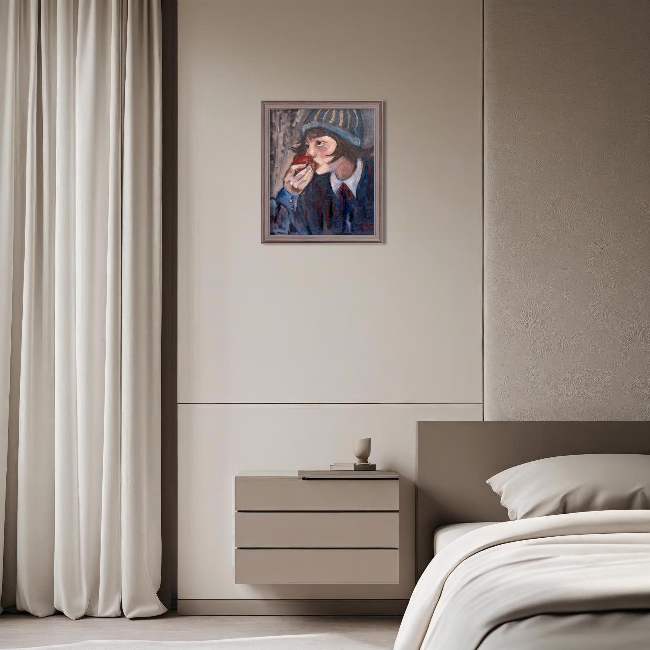 Temat: Obraz przedstawi prostą, codzienną czynność jedzenia jabłka przez młodą dziewczynę. Jednakże, ta prozaiczna scena służy jako formalny pretekst do ukazania głębszych, wewnętrznych treści. Dziewczyna nie jest przedstawiona w dynamicznej pozie, lecz w chwili skupienia, co nadaje scenie pewnej intymności i refleksyjności.