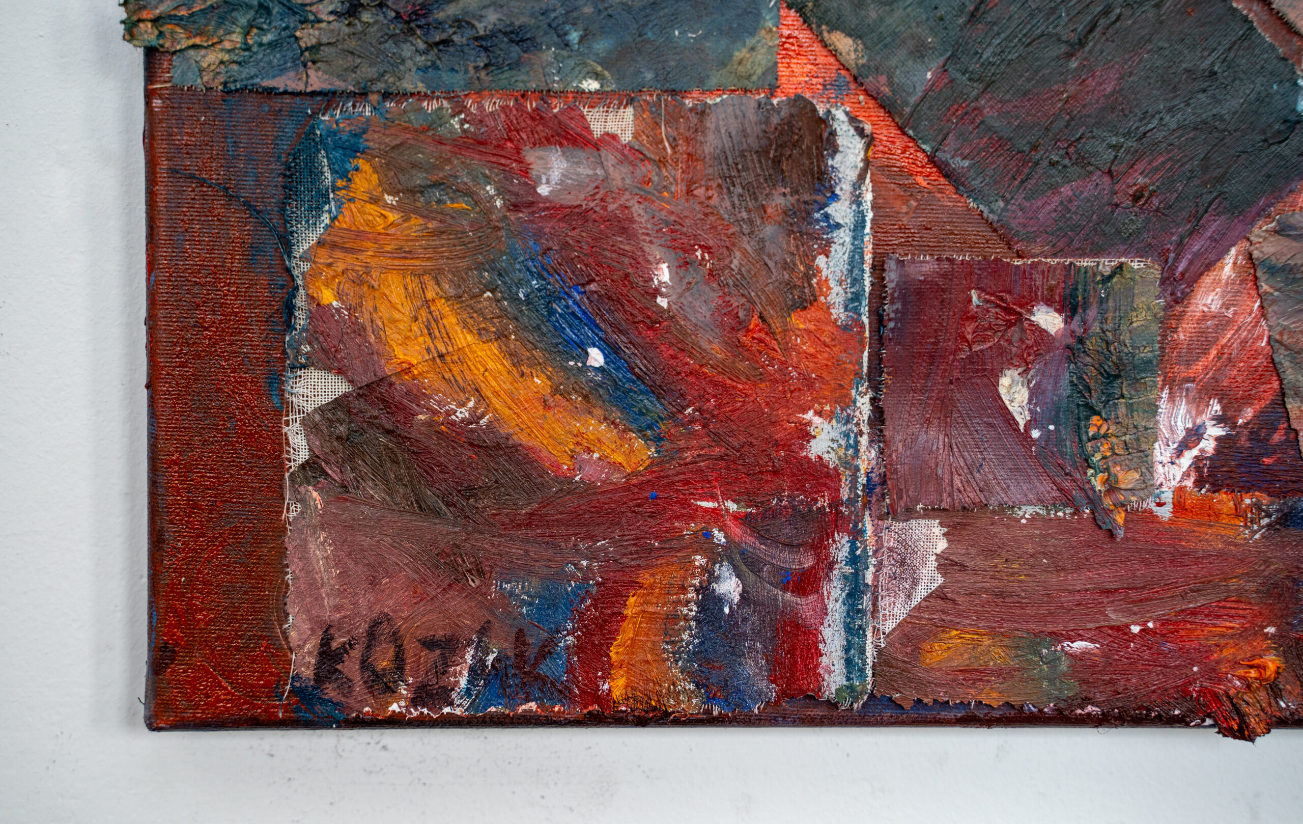 1. Ogólna paleta barwna obrazu jest nasycona i kontrastowa, z dominacją ciemnych błękitów i intensywnych czerwieni, które tworzą dramatyczny i emocjonalny nastrój, 2. Górna część obrazu (tło i przestrzeń nad postacią) jest malowana głębokim, niemal granatowym błękitem z domieszkami szarości i czerni, nadając jej ciężkości i mroku, 3. Czerwień w ubraniu postaci jest intensywna i głęboka, z widocznymi niebieskimi kropkami, tworząc dominujący akcent kolorystyczny w centralnej części obrazu, 4. Kolaż w dolnej części obrazu to dynamiczna mozaika barw, w których przeplatają się odcienie czerwieni, pomarańczy, brązów, zieleni i błękitów, 5. Skóra postaci jest przedstawiona w ciepłych, nieco zgaszonych tonach brązu, beżu i delikatnych różów, 6. W całej kompozycji pojawiają się także akcenty jasnych błękitów i bieli, które rozjaśniają niektóre fragmenty kolażu i dodają im świetlistości.