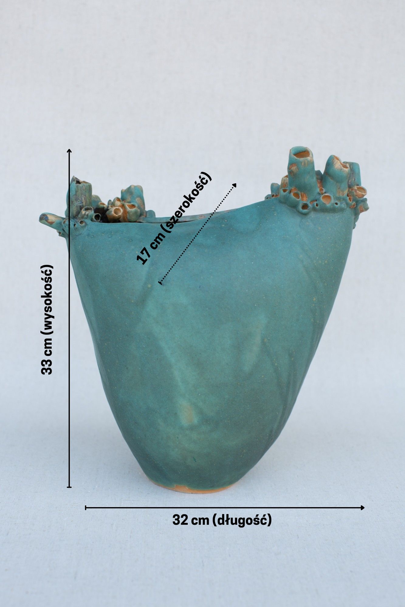 Proces tworzenia, który zachwyca. Proces powstawania tej wyjątkowej wazy to podróż przez tajniki rzemiosła artystycznego. Począwszy od ręcznego formowania elementów wyciętych z płata gliny, poprzez długotrwałe suszenie, aż po dwukrotny wypał w piecu – każdy etap wymaga precyzji i doświadczenia. Waza jest również pokrywana błyszczącym, turkusowym szkliwem, które nadaje jej intensywny, morski odcień, przywodzący na myśl głębię Bałtyku.