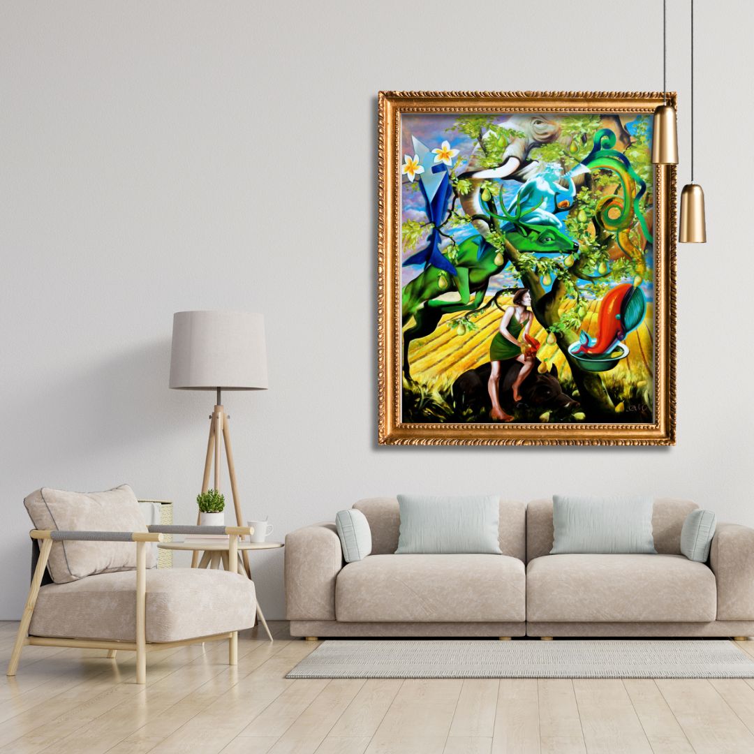 To fantastycznie kolorowy obraz, pełen jasnego światła i kapitalnych barwnych kontrastów i dopełnień. Scena jest zaludniona fantastycznymi zwierzętami, surrealistycznie rozmieszczonymi na tytułowym drzewie. Tło stanowi rozpoznawalny fragment rzeczywistości, przedstawiający kontrastowo zwyczajny, polny krajobraz.
