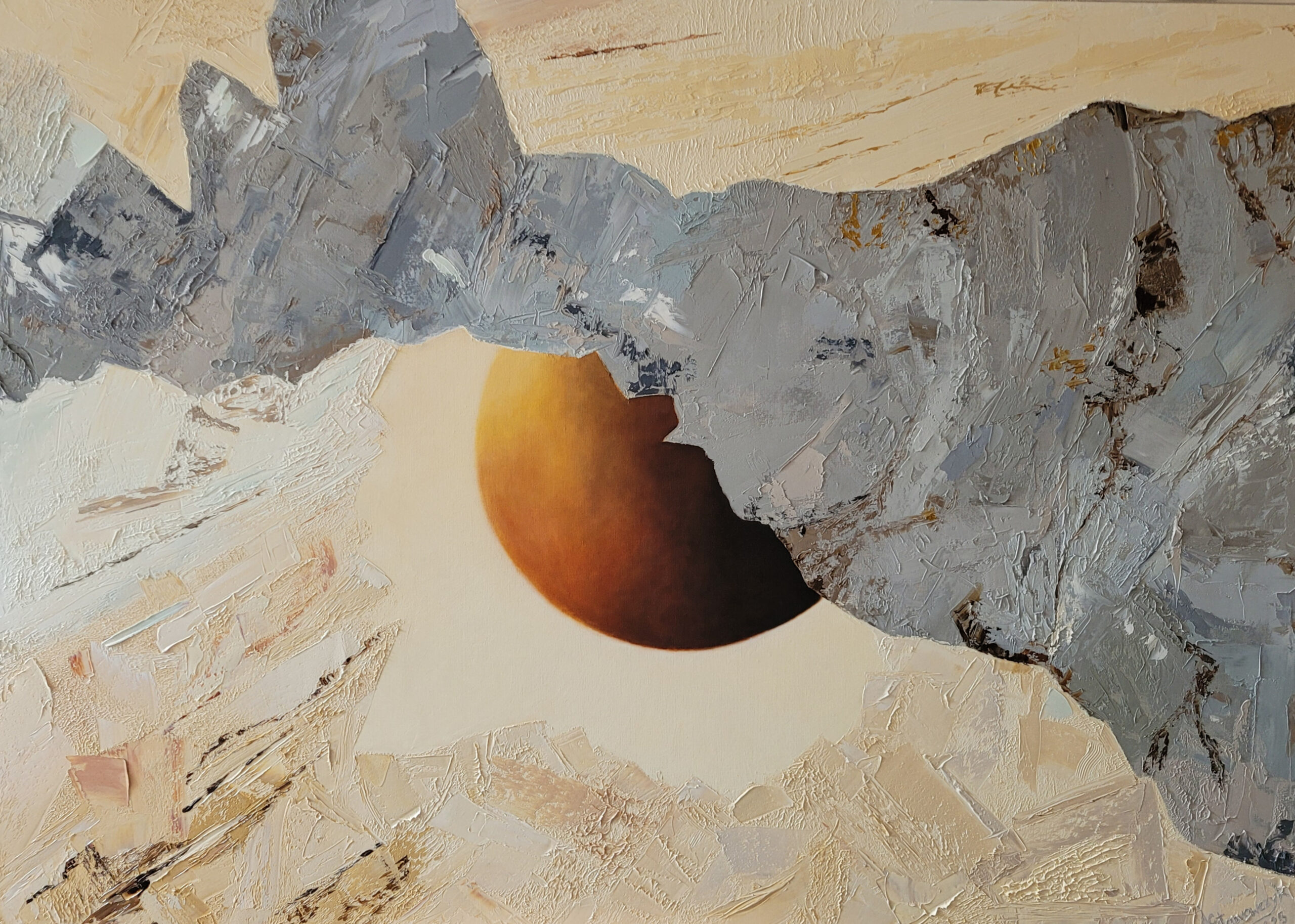 Obraz „Harmonia zmysłów II” to kolejne, niezwykle interesujące dzieło z najnowszego cyklu Anny Stawowczyk, powstałe w 2025 roku. Podobnie jak inne prace z tego cyklu, praca o wymiarach 140×100 cm, utrzymana w orientacji poziomej, jest świadectwem ewolucji stylu artystki. Znamienne dla jej twórczości balansowanie na granicy abstrakcji i fantastyki zyskuje tutaj nową, bardziej wyciszoną formę, skupioną na teksturze i subtelności barw. Kompozycja opiera się na kontraście między gładką, monochromatyczną powierzchnią a masywnymi, fakturowanymi bryłami, które rozcinają przestrzeń, tworząc wrażenie dynamicznego napięcia.