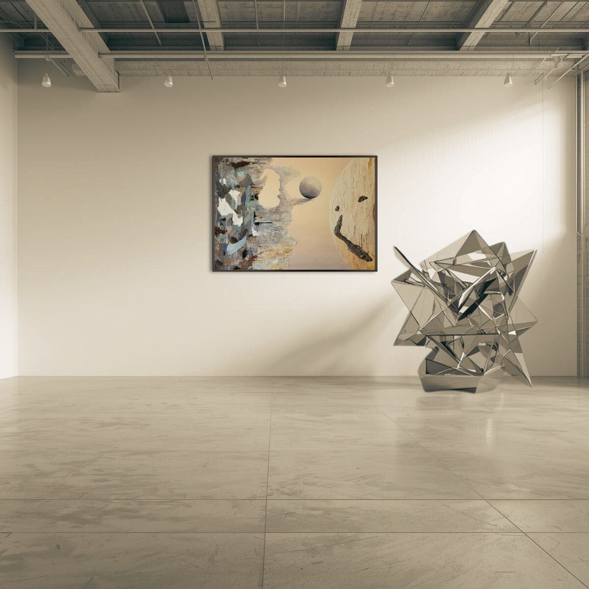 Tytuł „Harmonia zmysłów III” znajduje w tej pracy swoje najbardziej metafizyczne i duchowe odzwierciedlenie. W przeciwieństwie do poprzednich obrazów, które eksplorowały zderzenie i kumulację, ten obraz jest opowieścią o delikatnej równowadze. Centralnym punktem kompozycji jest mała, idealnie gładka kula, która wisi w przestrzeni, niczym medytacyjny punkt skupienia. Jest ona podtrzymywana przez wysunięty, niemalże palczasty fragment fakturowanej formy z lewej strony. Ten gest podtrzymania, delikatności i ostrożnej równowagi jest kluczowy dla interpretacji dzieła. Duża forma z prawej strony, z jej chropowatą, ale spokojną fakturą, przypomina powierzchnię księżyca lub odległej planety, wprowadzając do obrazu element kosmicznego spokoju. Całość staje się wizualną parabolą o poszukiwaniu harmonii, która nie jest walką, a aktem podtrzymania i delikatnego zbalansowania. Emocje i nastrój obrazu są spokojne, kontemplacyjne, wręcz medytacyjne, zachęcające do refleksji nad kruchością równowagi i koniecznością jej podtrzymywania.