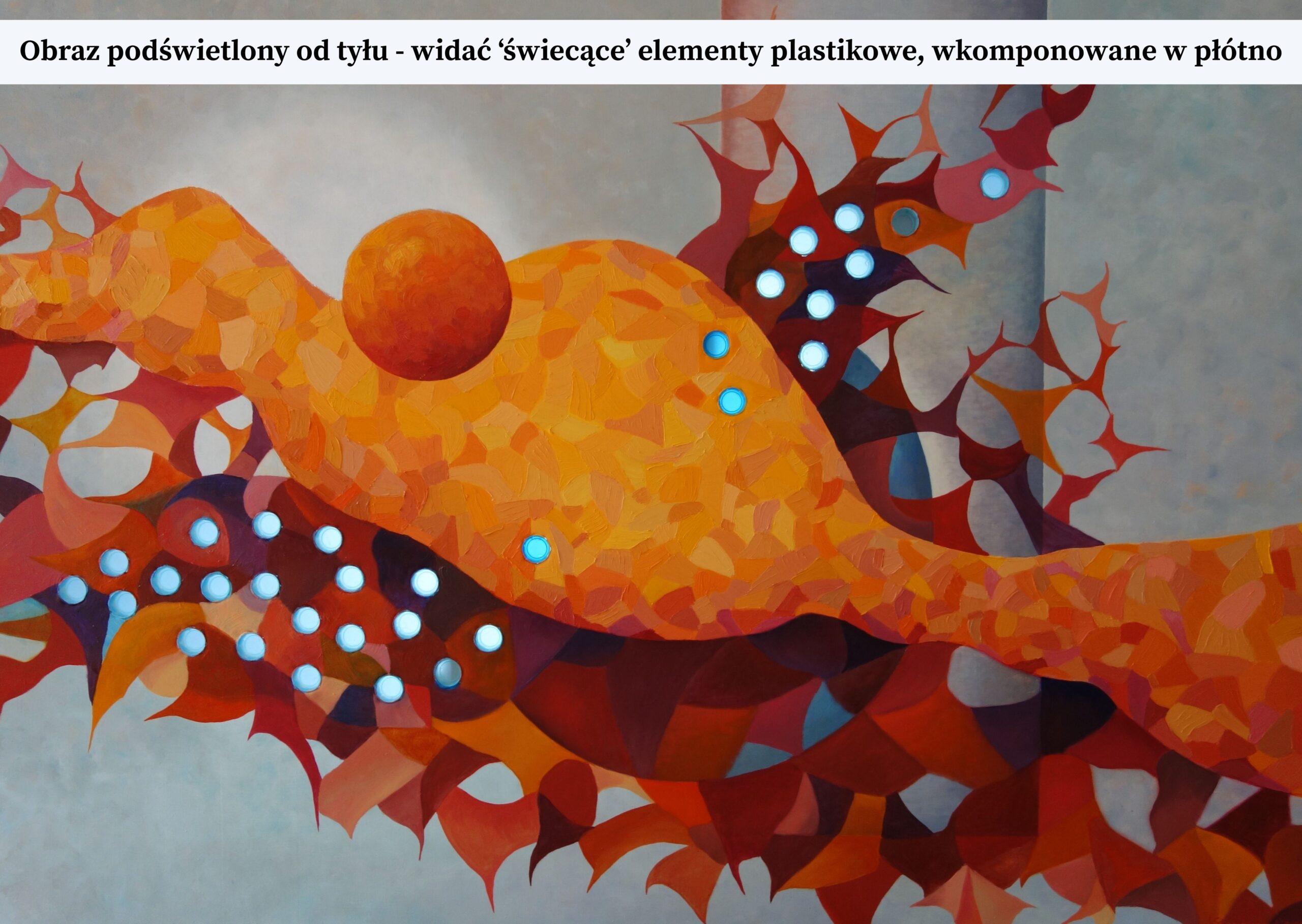 Falująca, gorąca forma, która rozrasta się w poprzek płótna, wydaje się być metaforą procesu akumulacji – zbierania i gromadzenia energii, emocji czy doświadczeń. Jej czerwień i pomarańcz mogą symbolizować narastające napięcie, gniew lub namiętność, które w końcu doprowadzają do wybuchu. Umieszczone na jej powierzchni niebieskie, plastikowe elementy wyglądają jak wtopione w ciało obiekty. Mogą symbolizować one obce, syntetyczne ciała w naturze, które kumulują się w nieskończoność i powoli ją wyniszczają. Mimo swojego abstrakcyjnego charakteru, obraz budzi głębokie skojarzenia z procesami zachodzącymi zarówno w przyrodzie, jak i w psychice ludzkiej. Emocje i nastrój są intensywne, pełne siły i witalności, z lekką nutą niepokoju.