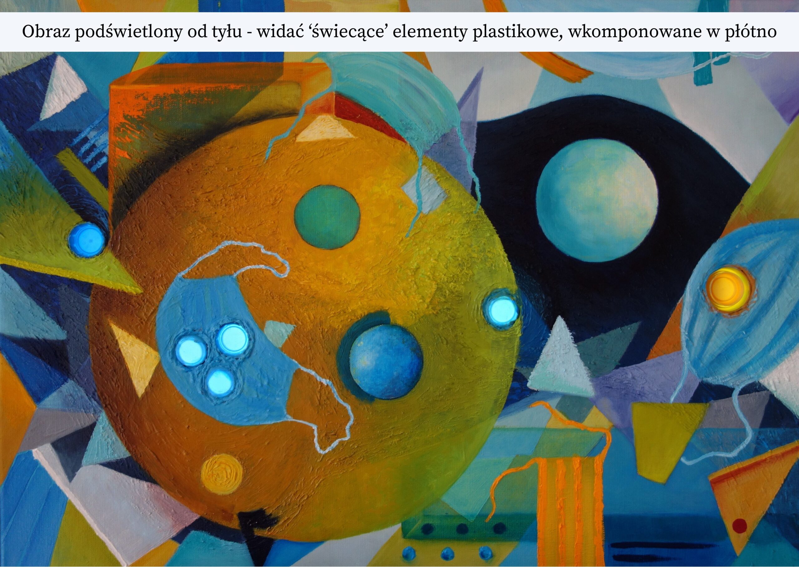 Kompozycja obrazu jest asymetryczna i opiera się na kontraście dużych, kolistych form z ostrymi, trójkątnymi kształtami. Dominującą, centralną pozycję zajmuje duża, okrągła forma, której powierzchnia przypomina chropowatą, księżycową rzeźbę. Wokół niej unoszą się trójkąty i prostopadłościenne bryły, tworzące wrażenie kosmicznego pejzażu. Detale w postaci wtopionych w farbę elementów plastikowych dodają obrazowi unikalnej tekstury i zaskakującej trójwymiarowości, mogących podkreślać przesłanie o ingerencji człowieka w środowisko naturalne.