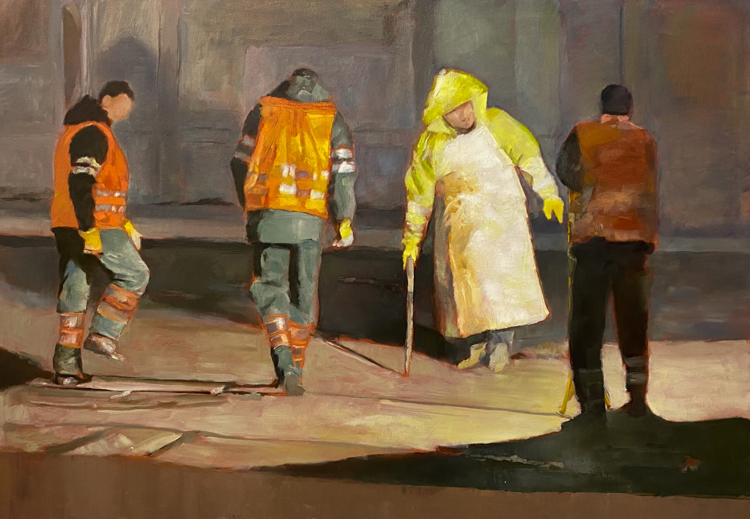 Podsumowanie: „Robotnicy” Bartosza Kościołka to poruszające i wizualnie frapujące dzieło, które poprzez mistrzowskie operowanie światłem i cieniem oraz charakterystyczną paletę barwną, zwraca uwagę na obecność i znaczenie pracowników fizycznych w miejskim środowisku, szczególnie w kontekście ich nocnej pracy. Artysta z empatią i bez patosu ukazuje ich wysiłek, zmuszając widza do refleksji nad ich rolą i widocznością w naszym codziennym życiu. Jest to kolejny mocny głos w artystycznej narracji Kościołka, przypominający o wartości i często niedocenianym trudzie tych, którzy kształtują nasze miejskie otoczenie.