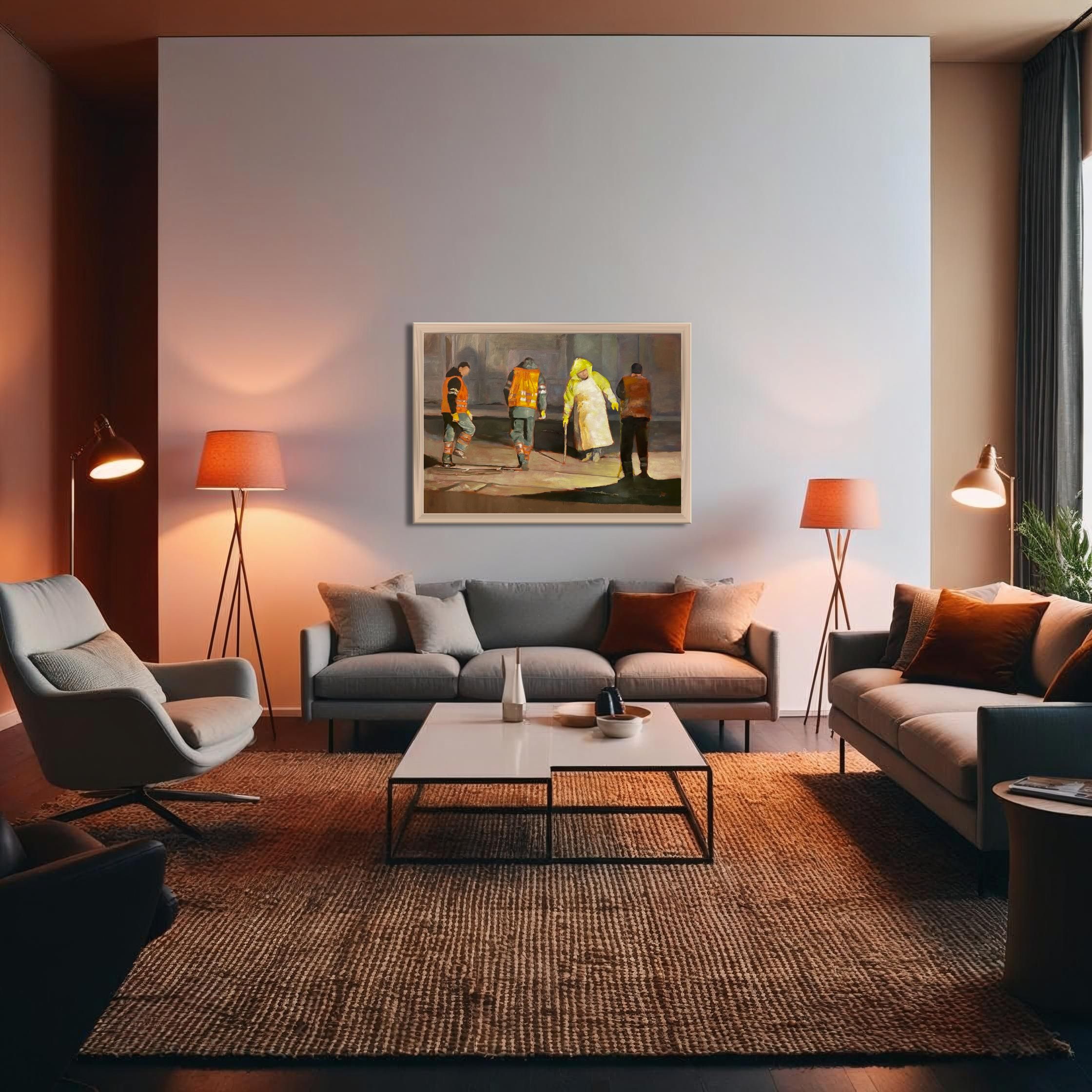 Wstęp: Obraz olejny Bartosza Kościołka zatytułowany „Robotnicy” to kolejne mocne i sugestywne przedstawienie osób wykonujących ciężką pracę fizyczną w przestrzeni miejskiej, tym razem uchwycone w scenerii nocnej pracy przy sztucznym oświetleniu. Artysta, wierny swojemu stylowi współczesnego realizmu, kontynuuje swoją misję wydobywania z anonimowości tych, którzy często pozostają niezauważeni w codziennym zgiełku miasta, mimo ich kluczowej roli w jego funkcjonowaniu.