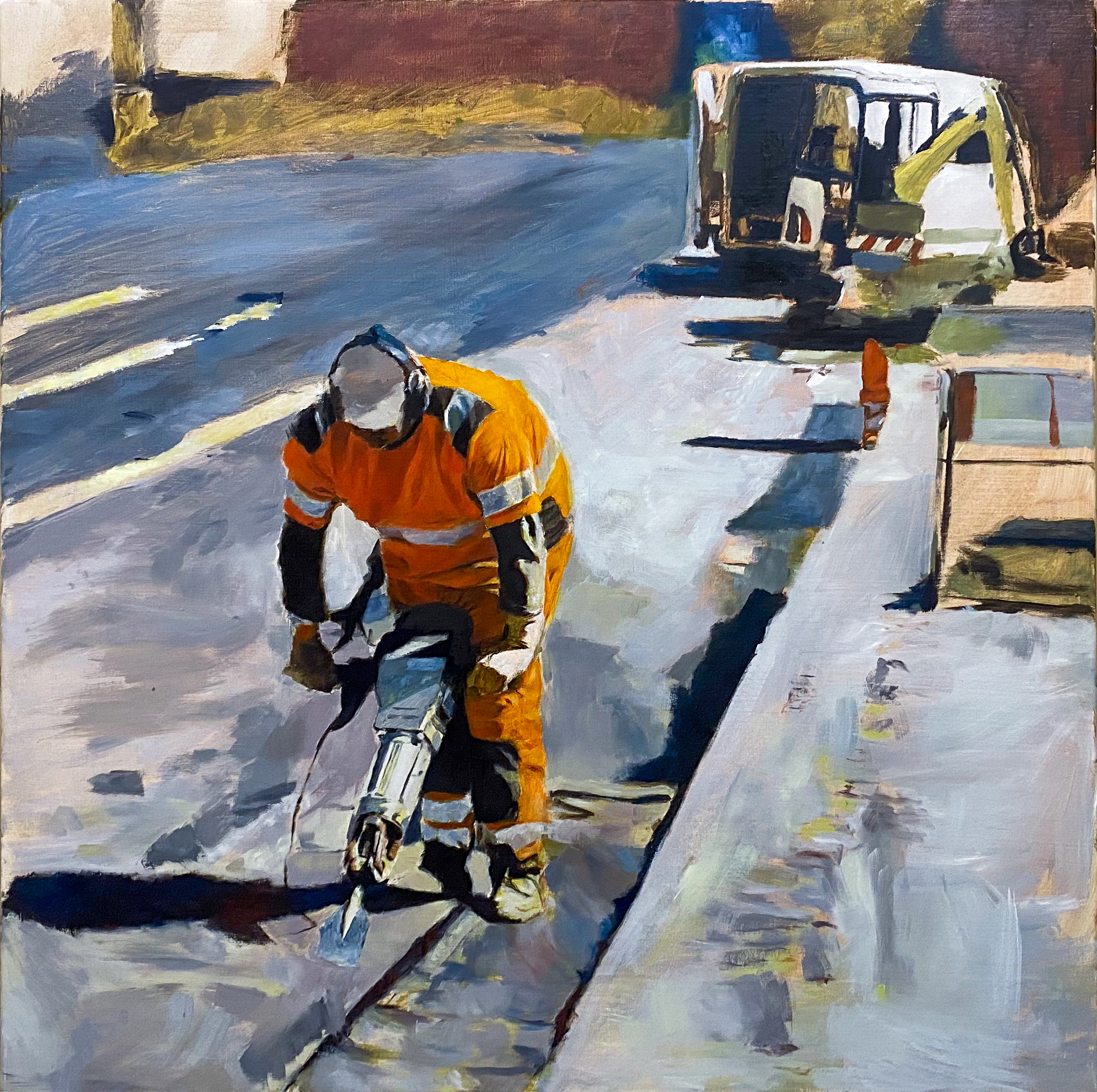 Kompozycja obrazu jest dynamiczna, a jednocześnie wyważona. Centralną postacią jest robotnik w jaskrawym, pomarańczowym kombinezonie, pochylony nad młotem pneumatycznym. Jego sylwetka, choć dominująca kolorystycznie, jest wpisana w diagonalny układ chodnika i jezdni, co nadaje scenie głębi i kierunku. Perspektywa, przedstawiona z poziomu przechodnia, pozwala widzowi niemalże fizycznie uczestniczyć w przedstawionej sytuacji.