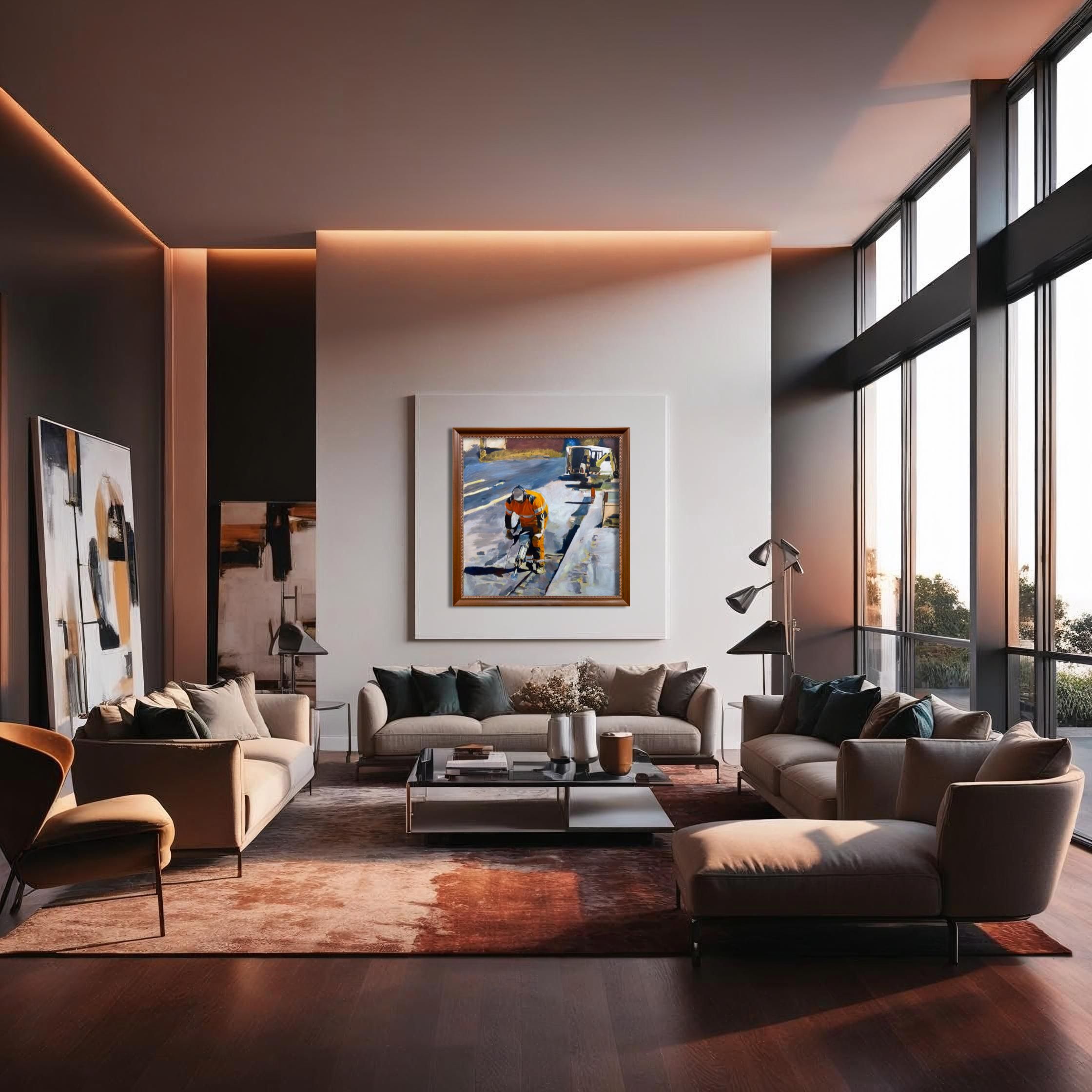 Paleta barwna obrazu opiera się na silnym kontraście. Intensywny pomarańcz kombinezonu robotnika wybija się na tle stonowanych szarości, błękitów i beżów miejskiego otoczenia. To zestawienie kolorystyczne nie tylko przyciąga wzrok do centralnej postaci, ale również podkreśla jej odmienność i widoczność w zwyczajnym, często monochromatycznym krajobrazie miasta. Chłodne odcienie cieni rzucanych przez postać i samochód dodają realizmu i modelują formy, budując wrażenie trójwymiarowości. Użycie światła jest subtelne, ale efektywne – długie cienie sugerują konkretną porę dnia i padanie światła, co wzmacnia atmosferę sceny.