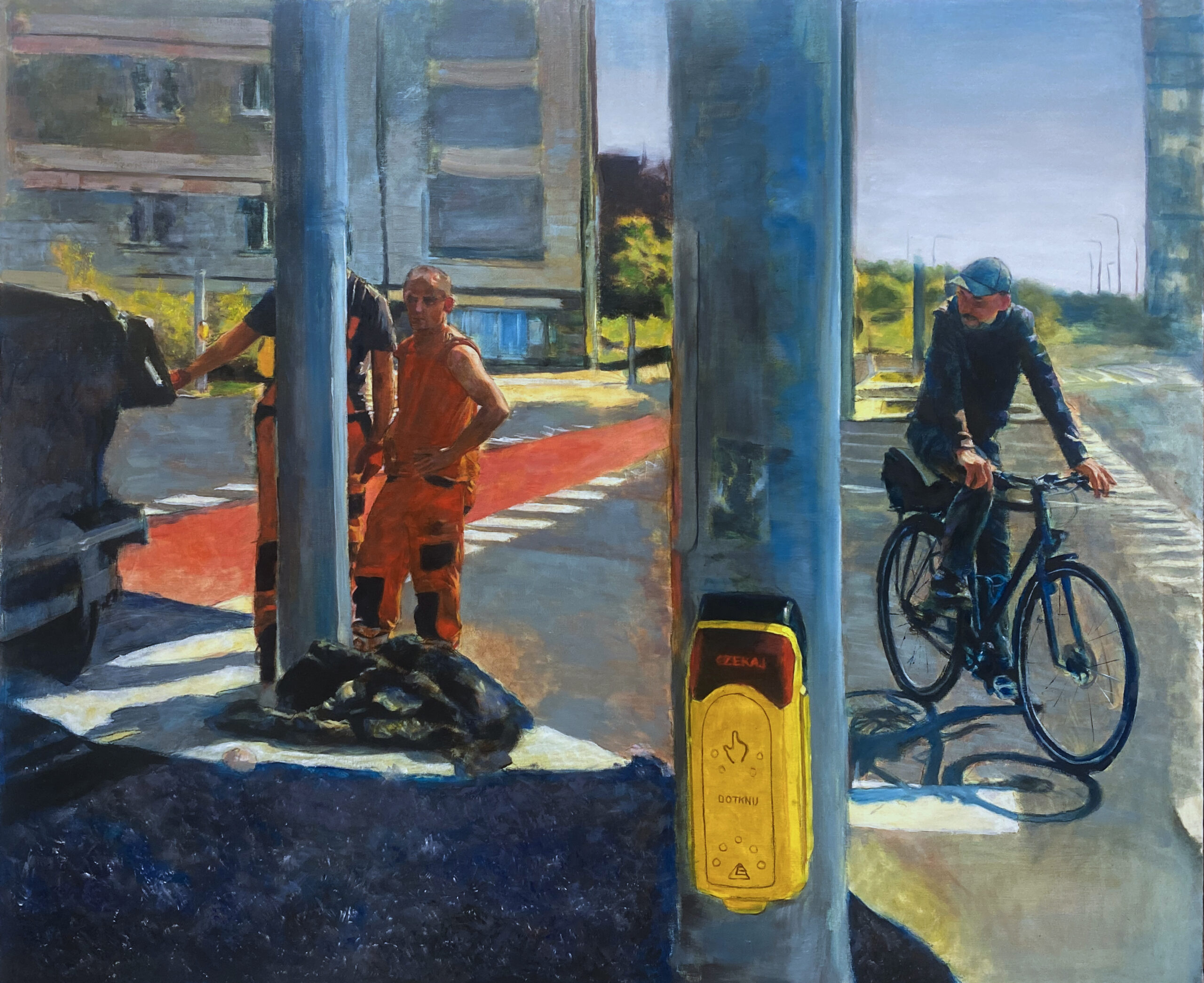 Podsumowanie: „Znowu Robią (II)” Bartosza Kościołka to jego kolejne dojrzałe dzieło, które z formalną precyzją i społeczną wrażliwością analizuje relacje między pracownikami fizycznymi a przestrzenią miejską i jej innymi użytkownikami. Poprzez kontrastową paletę barwną, dynamiczną kompozycję i uchwycenie ulotnej chwili oczekiwania, artysta zwraca uwagę na obecność i status tych często pomijanych postaci. Nie jest to jedynie realistyczne przedstawienie sceny, lecz subtelna refleksja nad rolą i widocznością ludzi pracujących w naszym codziennym otoczeniu.