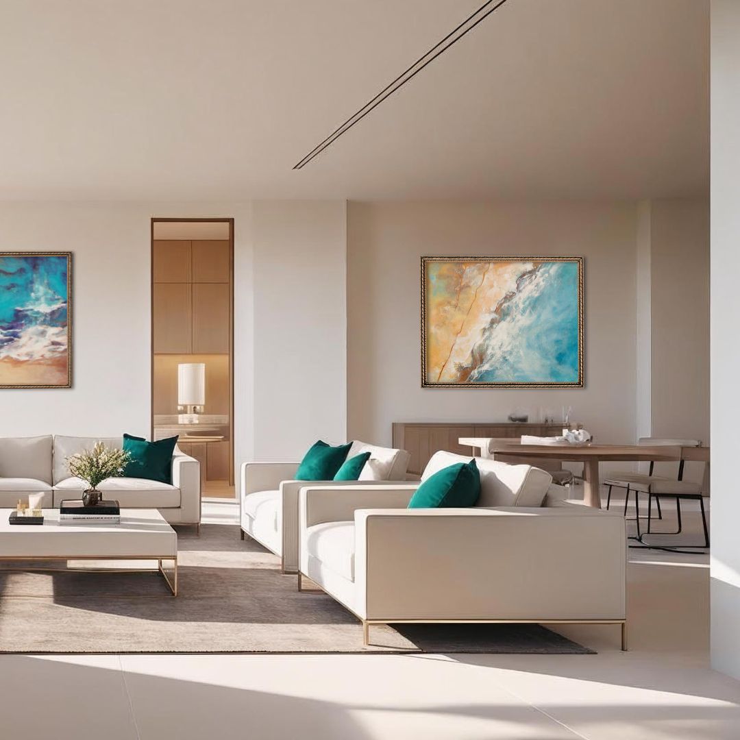 Linia i kształt: Kształty i linie są miękkie i płynne, oddając naturalny kształt wybrzeża i ruch fal. Delikatne przenikanie się kolorów tworzy miękkie kontrasty, a brak ostrych krawędzi wzmacnia wrażenie subtelności.