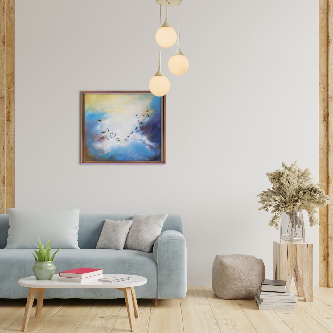 Obraz akrylowy Beaty Będkowskiej pod tytułem „Odlot V”, należący do cyklu „Na styku nieba i ziemi”, to studium dynamiki i przestrzeni, uchwycone z impresjonistyczną lekkością.