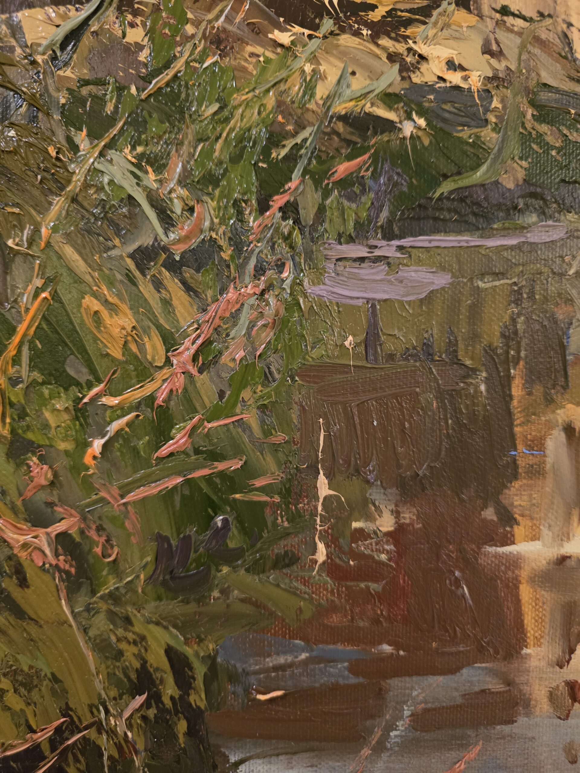 Ta specyficzna technika malarska nie tylko stanowi o indywidualnym stylu artysty, ale również doskonale oddaje surowy i naturalny charakter przedstawianego krajobrazu. Gruba faktura płótna staje się integralną częścią narracji obrazu, wzmacniając sensoryczne doświadczenie odbiorcy i niemal pozwalając mu poczuć wilgotne powietrze znad rzeki i szorstkość leśnej roślinności.