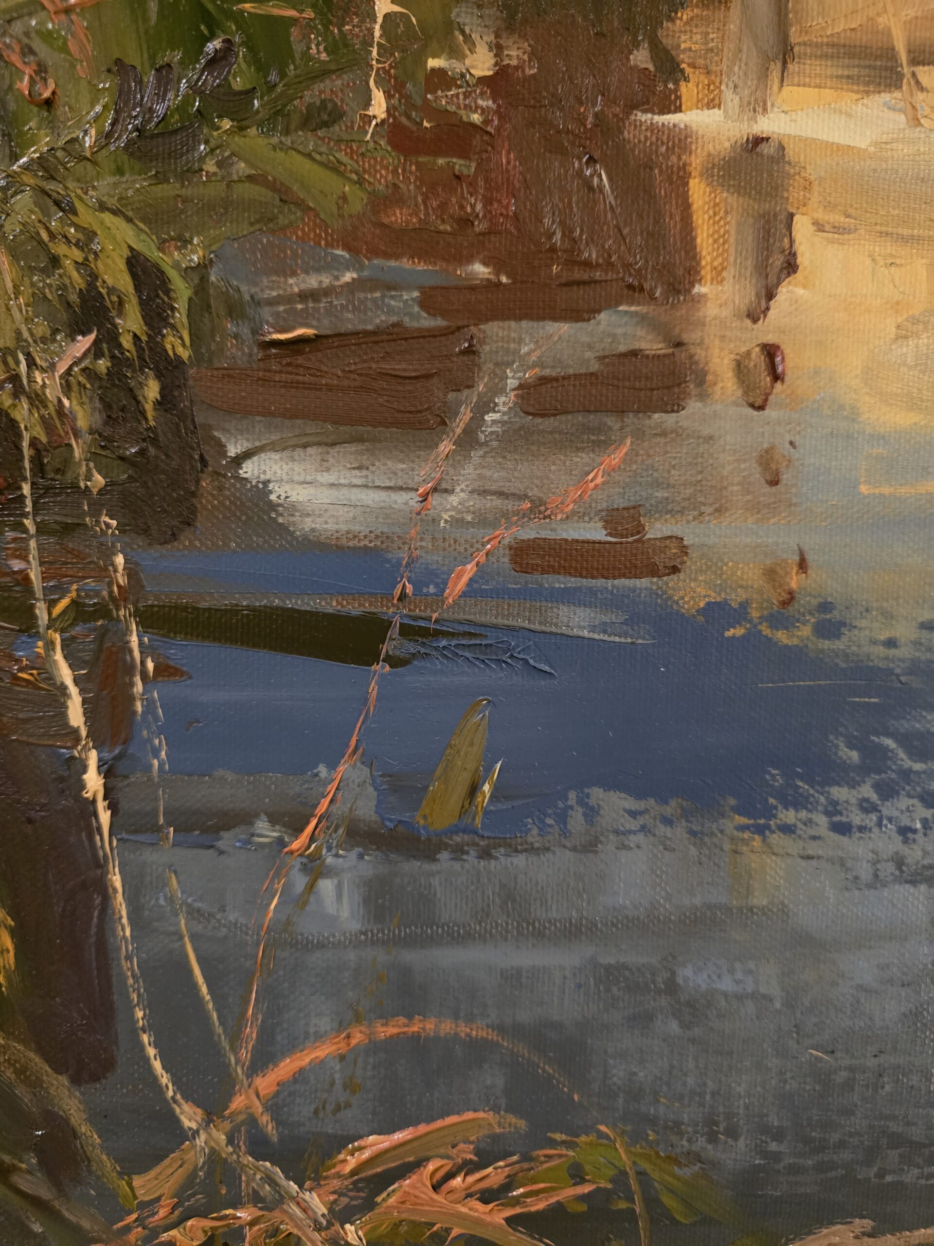 Również w partiach wody artysta nie stroni od nakładania farby z wyczuwalną fakturą. Choć woda zazwyczaj kojarzy się z gładką powierzchnią, u Gromackiego nawet tutaj wyczuwamy ruch i głębię dzięki zróżnicowanej grubości warstw farby i kierunkowi pociągnięć pędzla. Światło załamujące się na tych wypukłościach intensyfikuje kolor i dodaje obrazowi witalności.