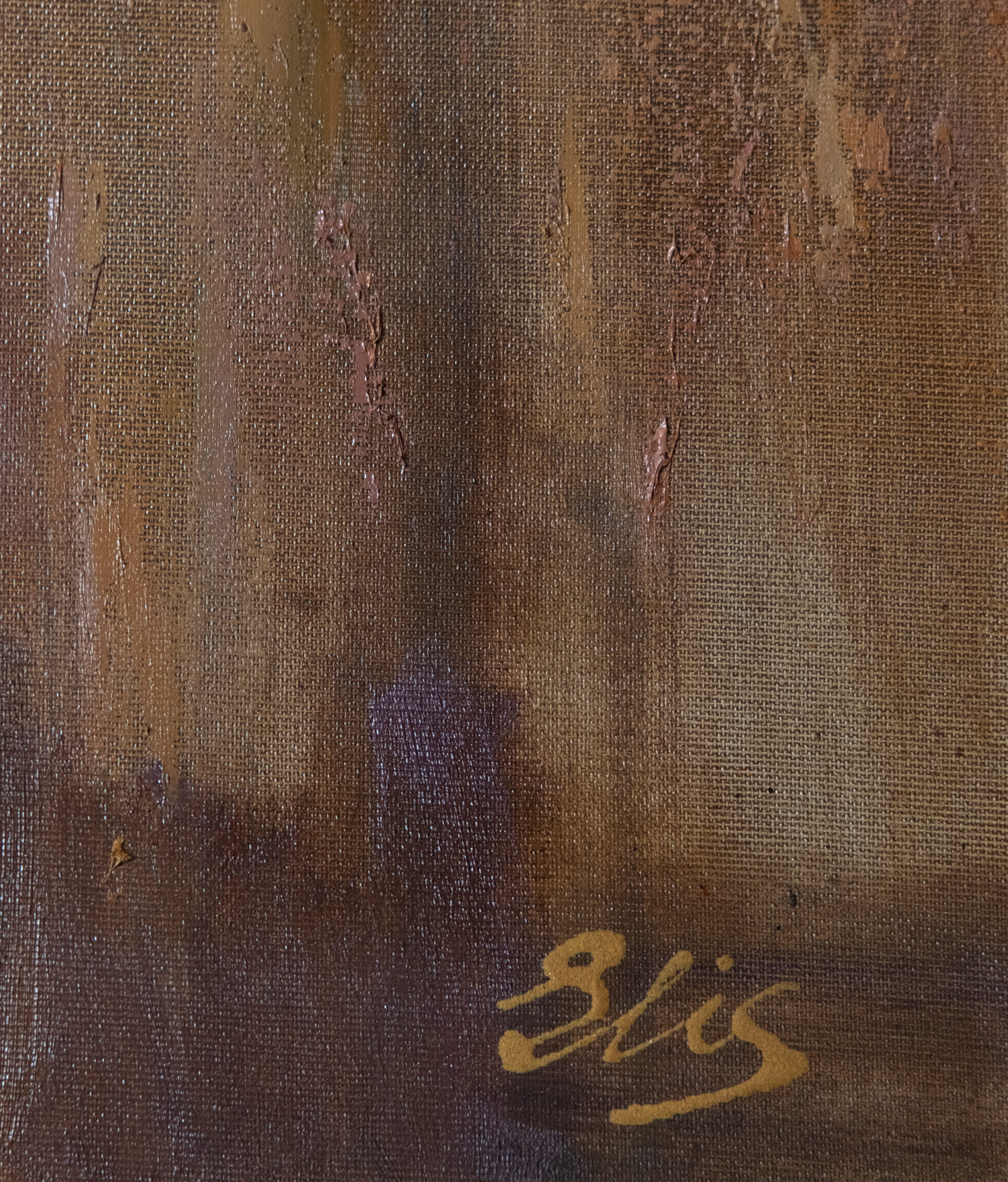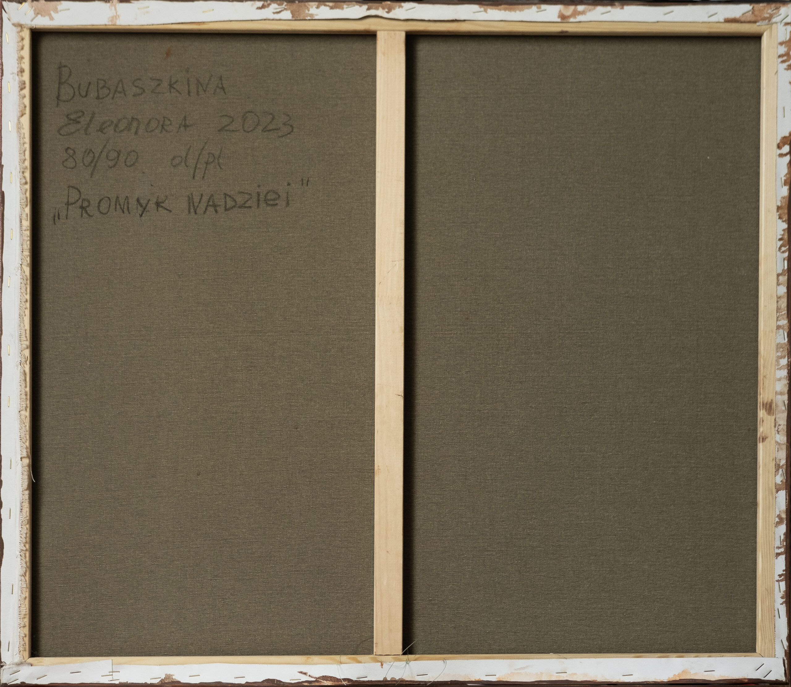 Sygnatury: malarka podpisała obraz na froncie płótna swoim pseudonimem artystycznym “Elis”. Sygnatura jest umieszczona w prawym, dolnym rogu. Na odwrociu płótna w lewym, górnym rogu widoczny jest opis wykonany ręcznie przez malarkę: “Bubashkina Eleonora, 2023, 80/90. ol/pl, „Promyk nadziei”.
