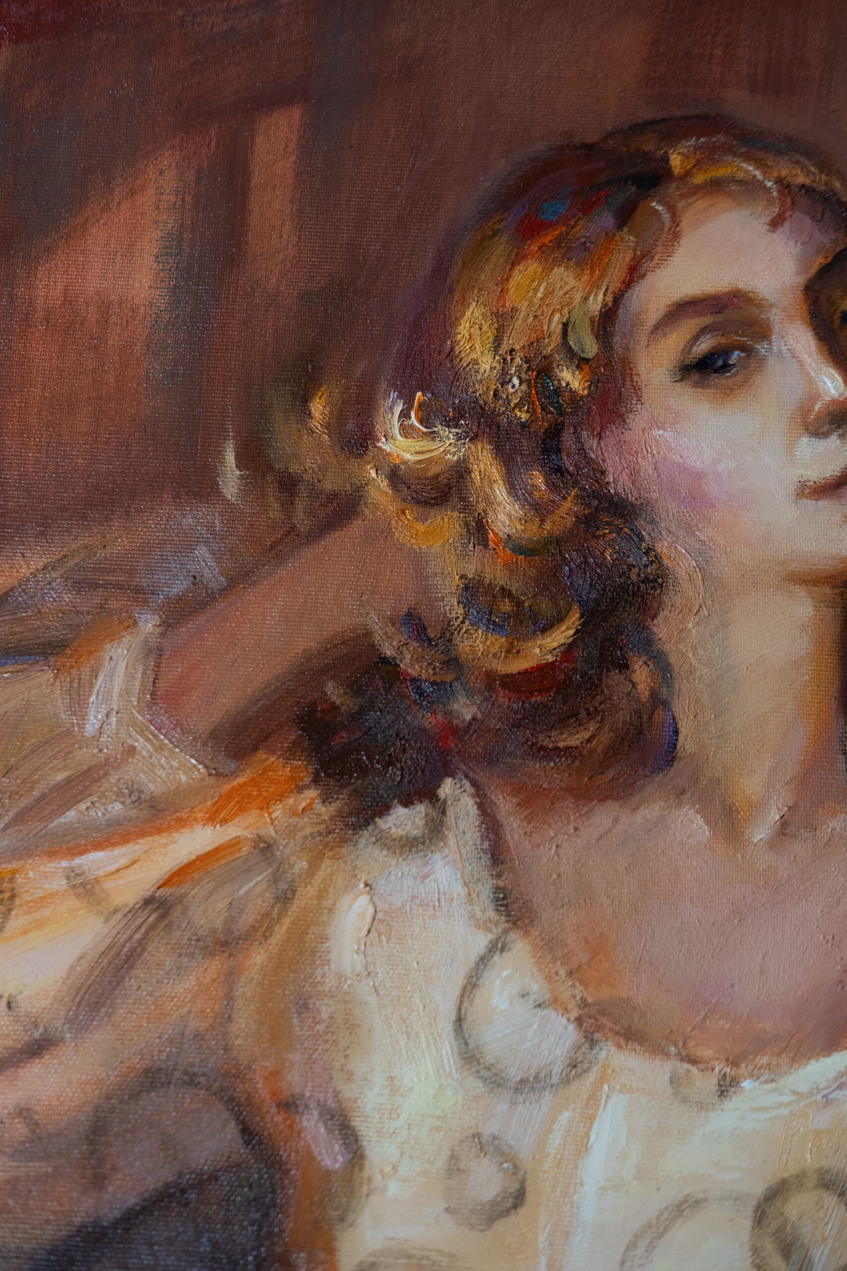 Promyk nadziei – liryczny portret w ciepłych tonacjach. Ten niezwykły obraz olejny to pełne emocji dzieło, które przeniesie Cię w świat marzeń i refleksji. Jest to namalowana w 2023 roku reinterpretacja wcześniejszego, pochodzącego z 2019 r. obrazu artystki pt. “Jasne światło” (link do niego znajdziesz tutaj).