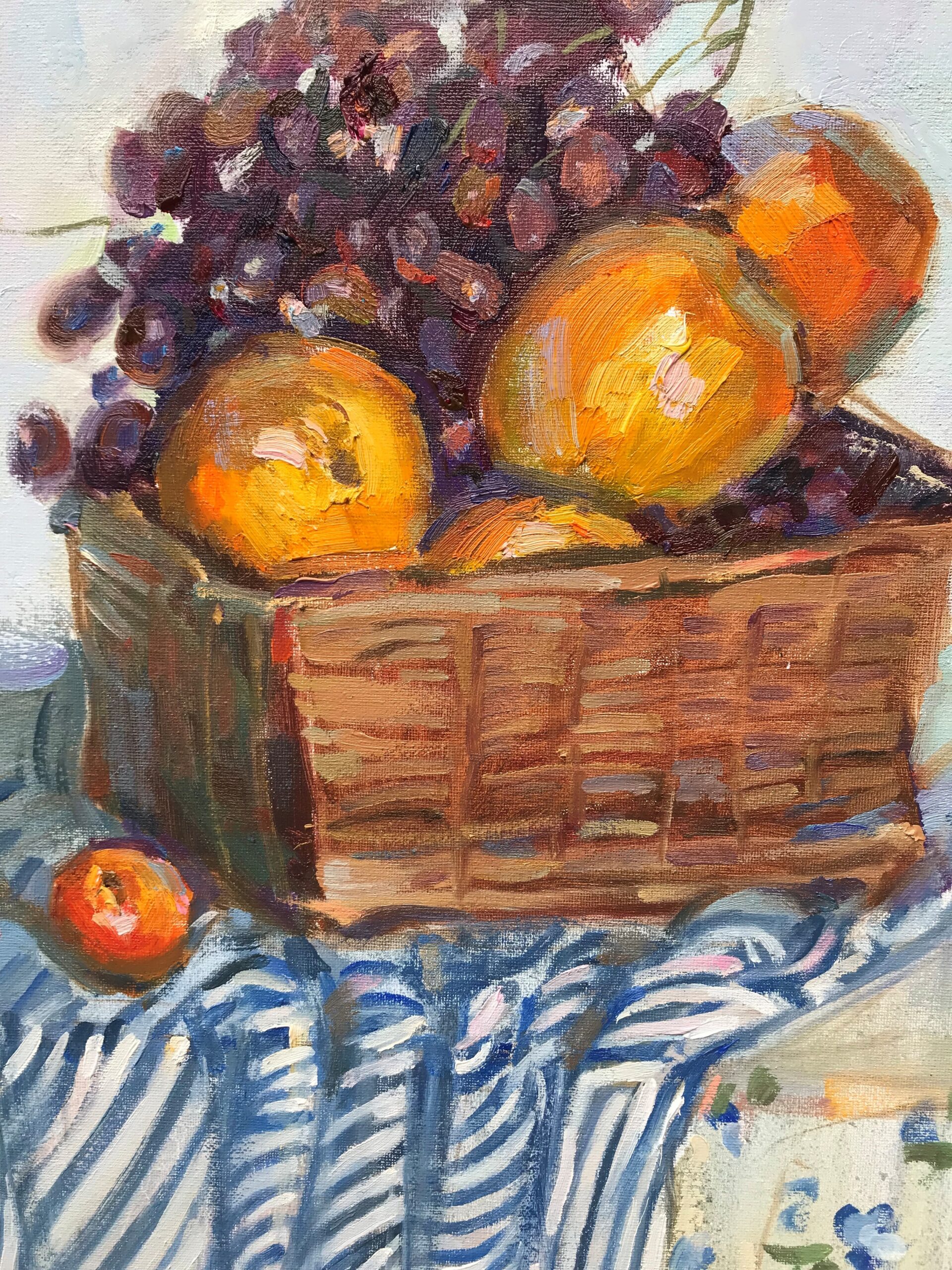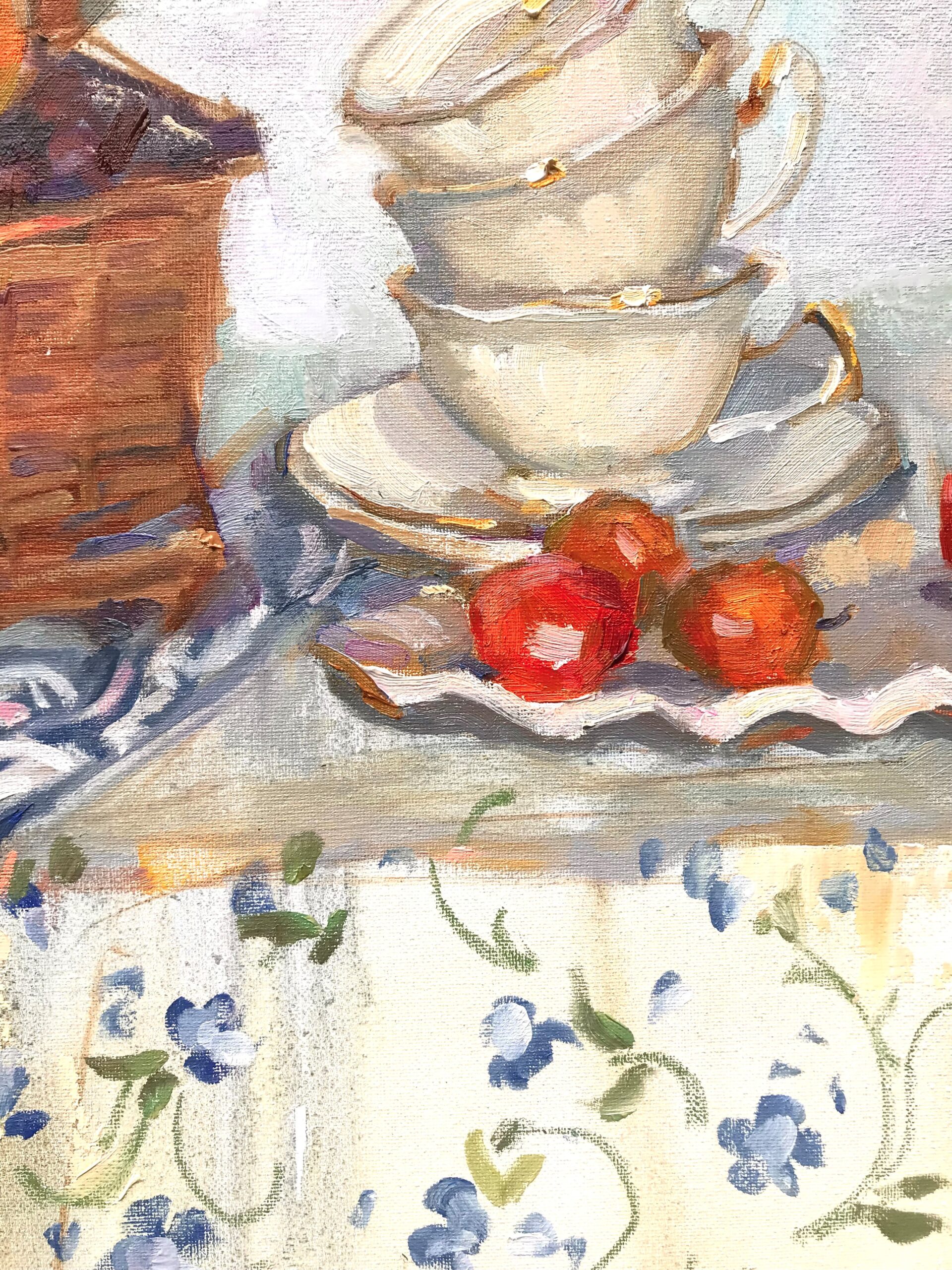 Siłą tego obrazu jest niezwykła biegłość malarska. Bubashkina z odwagą i swobodą operuje pędzlem, kładąc farbę energicznymi, widocznymi pociągnięciami, które budują formę i fakturę. Możemy niemal poczuć chropowatość wiklinowego kosza, gładki chłód porcelanowych filiżanek i soczystą ciężkość owoców. Artystka z lubością zderza ze sobą różne wzory i materie – regularne, błękitne pasy obrusu dynamicznie spływają z krawędzi stołu, kontrastując z delikatnym, kwiatowym deseniem drugiego materiału. Ta gra deseni, w połączeniu z żywą, świetlistą paletą barw, gdzie ciepłe oranże owoców wibrują na tle chłodnych błękitów i bieli, nadaje całej scenie niezwykłej energii.