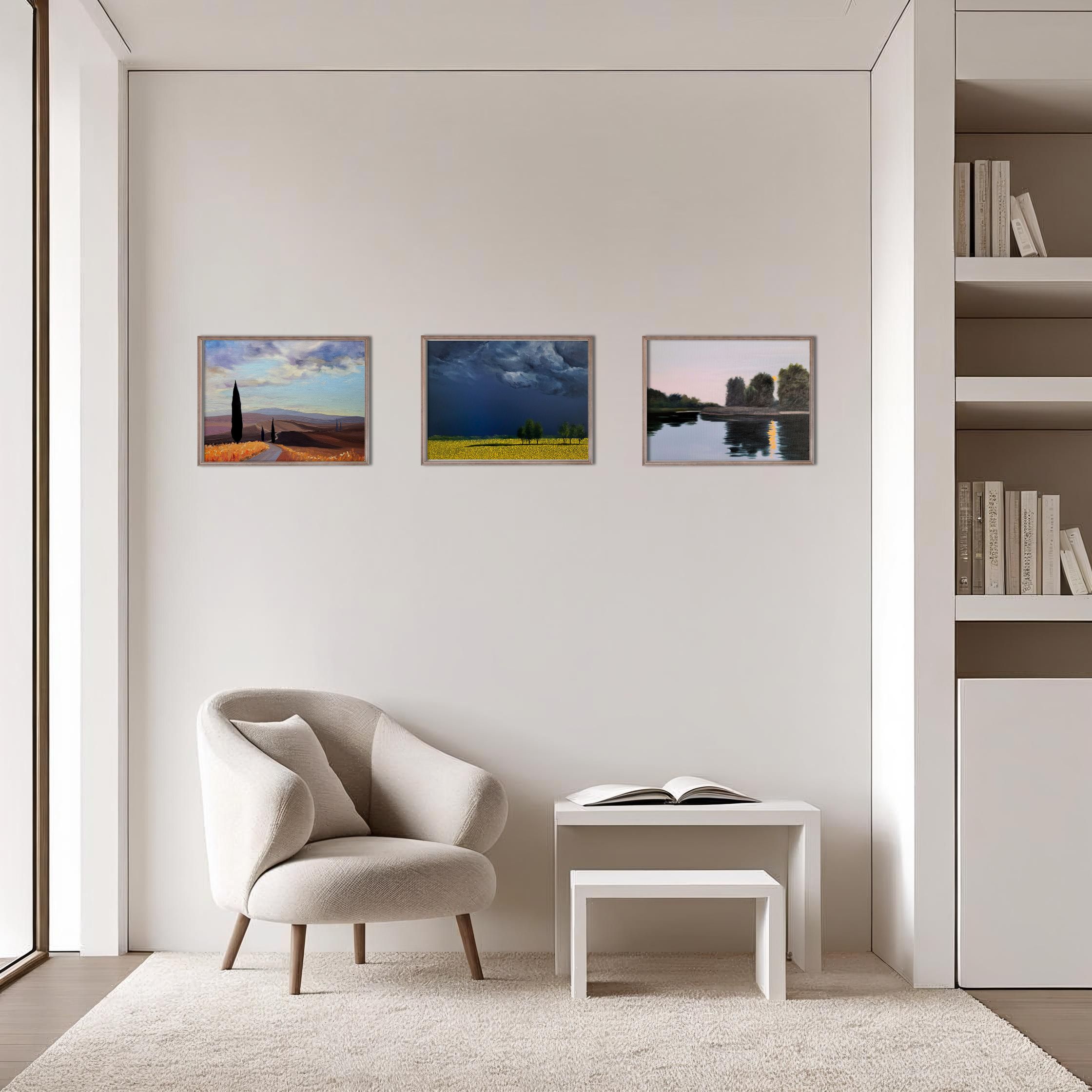 Wskazówki Dotyczące Ekspozycji: Ze względu na stosunkowo niewielkie rozmiary (40×30 cm), “Paesaggio VII” najlepiej prezentować w kameralnym otoczeniu, gdzie widz może zbliżyć się do obrazu i docenić jego detale oraz subtelności. Idealnym miejscem byłaby dobrze oświetlona ściana w salonie, sypialni lub gabinecie, gdzie obraz mógłby stać się punktem centralnym, ale nie dominującym. Sugerowane jest umieszczenie go na wysokości oczu, aby perspektywa obrazu naturalnie współgrała z perspektywą obserwatora. Dobre oświetlenie punktowe (np. niewielka lampka skierowana na obraz) podkreśli blask słońca na wodzie i wydobędzie głębię kolorów. Obraz doskonale pasowałby do wnętrz utrzymanych w jasnych, stonowanych barwach, które nie konkurowałyby z jego delikatną kolorystyką. Może być eksponowany samodzielnie lub w zestawie z innymi, podobnymi rozmiarami pracami Malinowskiego, tworząc spójną galerię małych formatów.