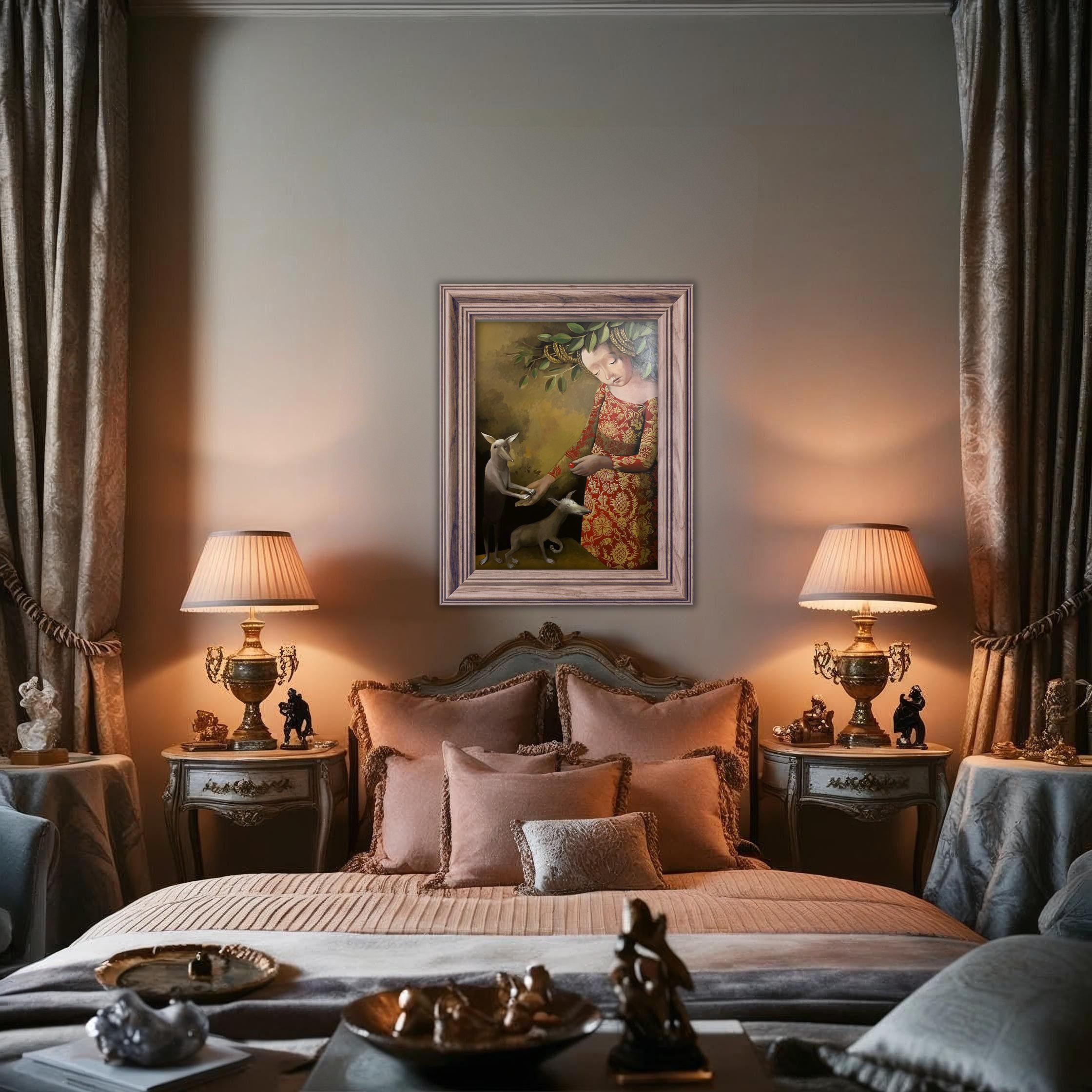 Kompozycja: Obraz charakteryzuje się statyczną, niemal hieratyczną kompozycją. Centralnie umieszczona postać kobiety stanowi główny punkt zainteresowania, a zwierzęta są umieszczone poniżej, tworząc trójkątny układ. Delikatny gest karmienia łączy wszystkie elementy kompozycji. Ciemne tło skupia uwagę na postaciach i ich interakcji.