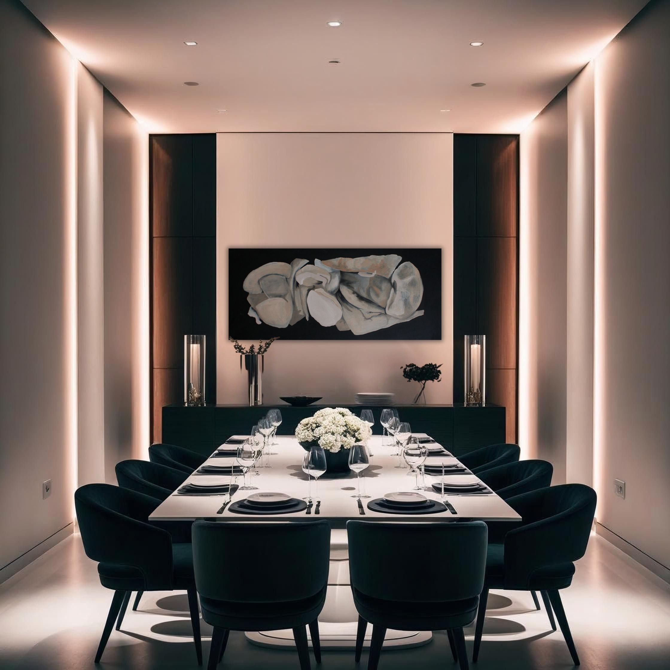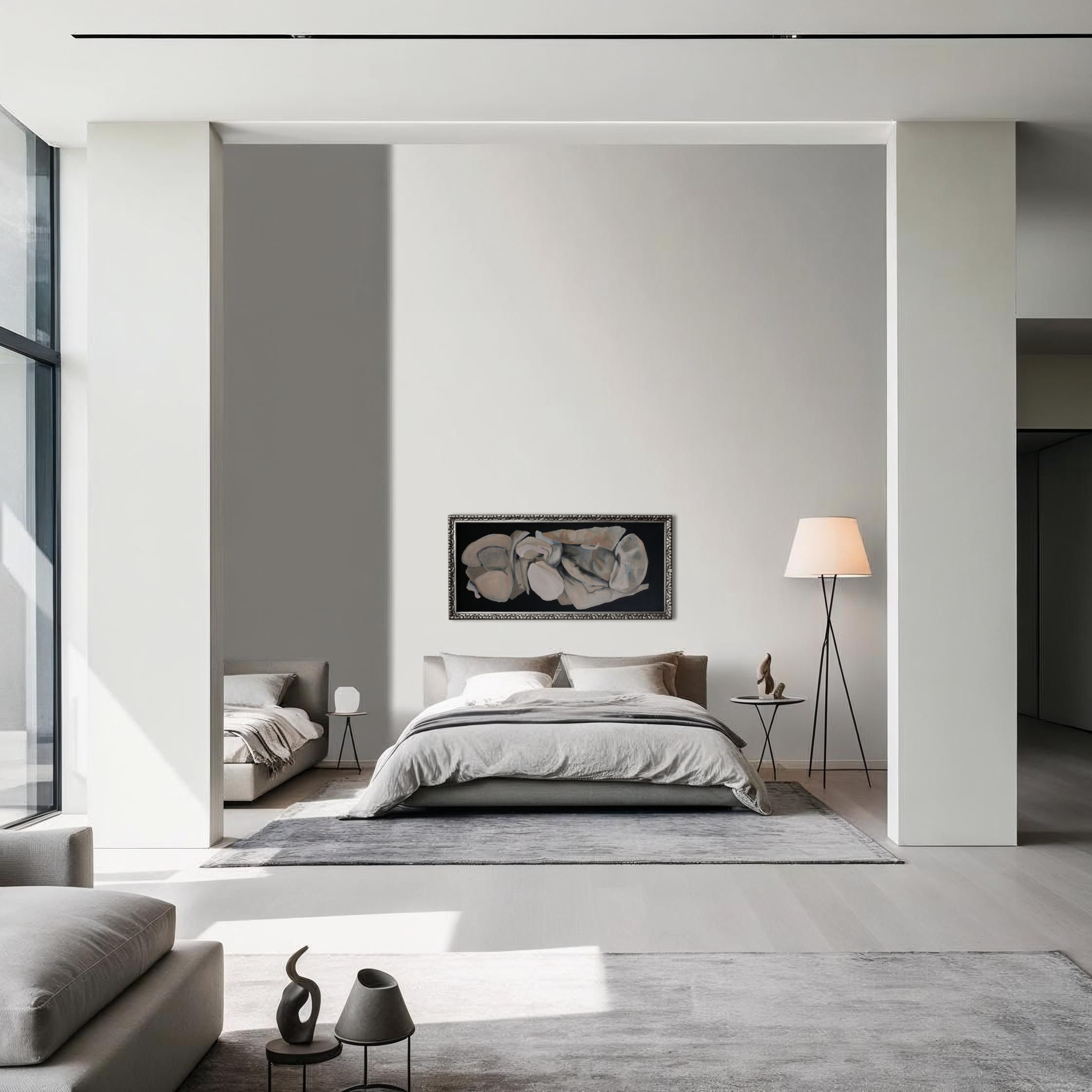 1. Paleta barwna obrazu jest świadomie ograniczona i skupiona na subtelnych niuansach tonalnych oraz fakturalnych, osadzonych na kontrastującym tle, 2. Obraz posiada głębokie, matowe CZARNE tło. Ma kluczowe znaczenie i stanowi silny kontrast dla centralnych form, podkreślając ich kształt, walor i teksturę, 3. Główna paleta barwna jest skoncentrowana na zniekształconych, abstrakcyjnych, centralnych formach: dominują tutaj różnorodne odcienie SZAROŚCI, ciepłych BEŻY i akcenty BIELI.