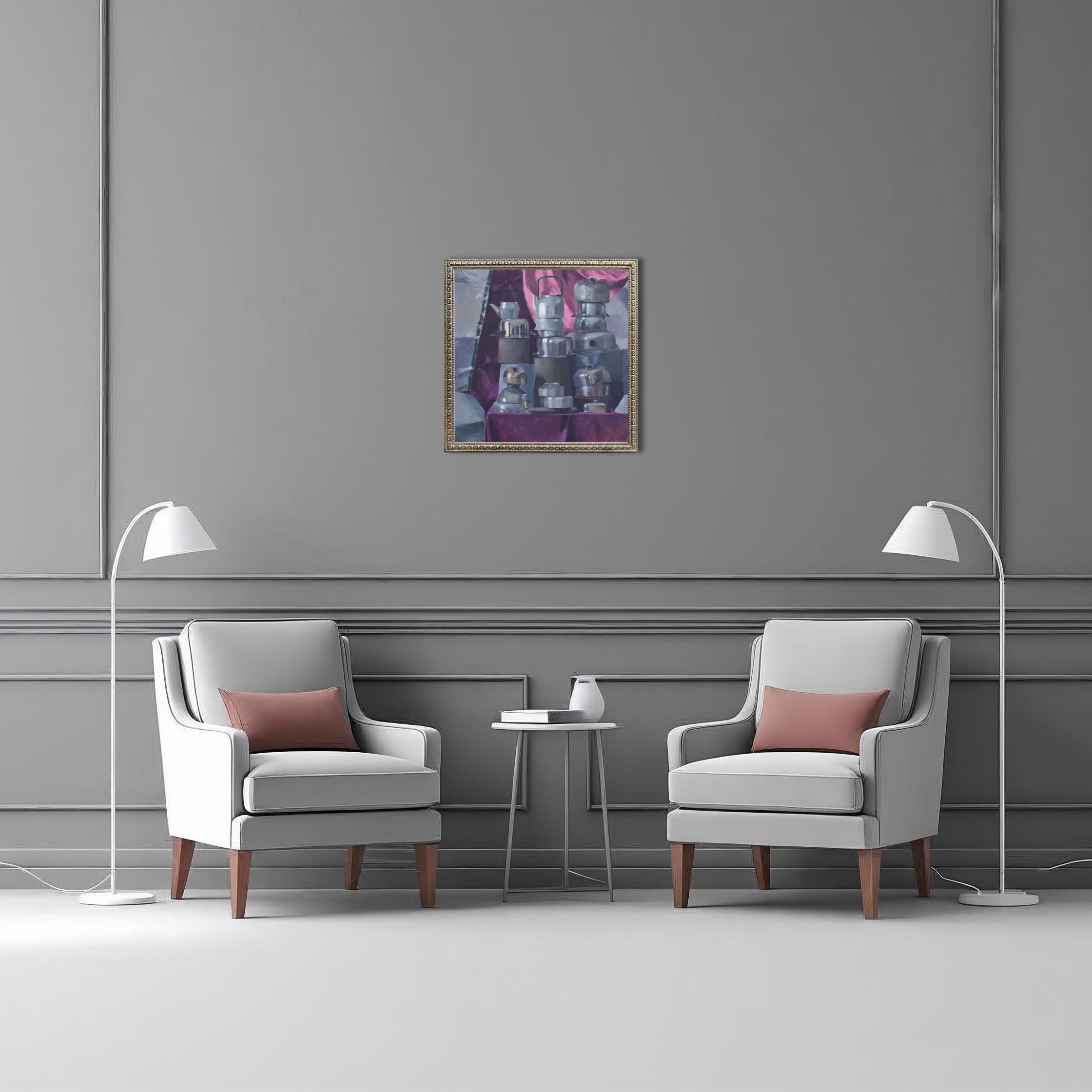 Temat obrazu jest z pozoru prosty i klasyczny. Jednakże, sposób, w jaki Małgorzata Jakieła podchodzi do tego tematu, przekracza ramy zwykłego przedstawienia przedmiotów. Artystka nie tylko wiernie oddaje teksturę i blask metalu, ale także nadaje przedmiotom pewną monumentalność i charakter.