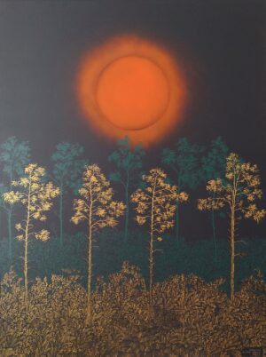 “O świcie II” to niezwykle malownicze dzieło, które przenosi nas w serce dziewiczej przyrody. Obraz stanowi liryczną interpretację wczesnorannego leśnego pejzażu, gdzie dominują subtelne przejścia światła i cienia, a kolorystyka odzwierciedla magiczną aurę świtu.