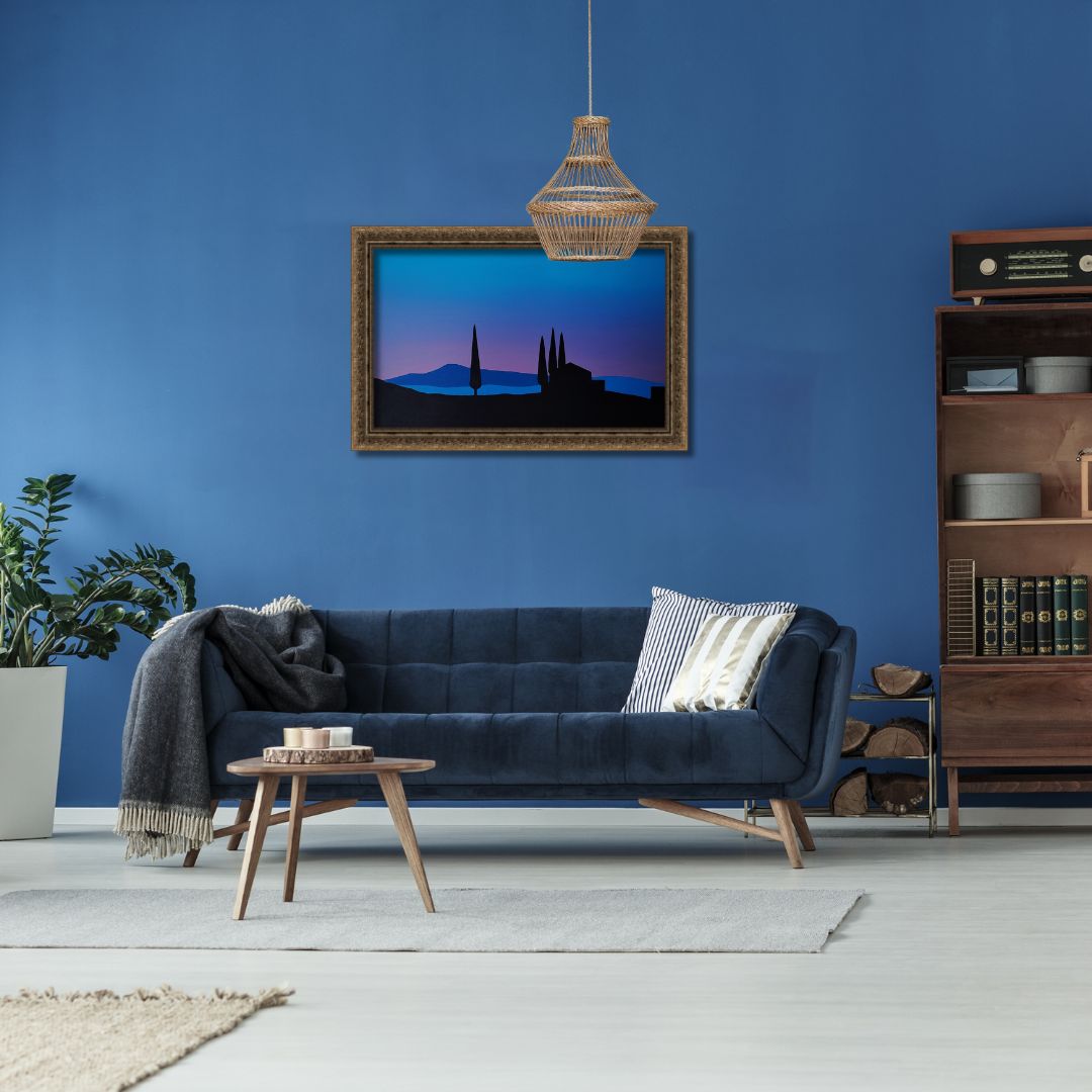 Obraz L’ultima luce della Val d’Orcia (Ostatnie światło dnia w dolinie Val d’Orcia) to bardzo udany przykład minimalistycznego pejzażu, w którym artysta Jacek Malinowski, znany ze swoich włoskich motywów, skupia się na esencji krajobrazu. Dominującą rolę odgrywają tutaj proste, geometryczne formy: sylwetki cyprysów, łagodne linie wzgórz i niebo. Całość utrzymana jest w ograniczonej palecie barw, co potęguje wrażenie spokoju i harmonii.