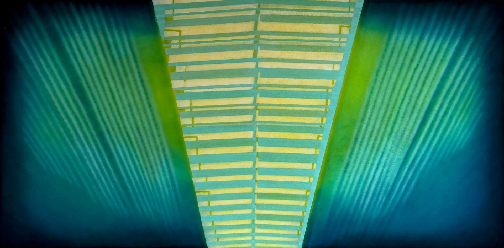 Świetlisty, centralny trapez staje się symbolem celu, do którego dążymy, podczas gdy rytmiczne, promieniste linie boczne oddają dynamikę przemieszczania się. Artysta stawia przed nami fundamentalne pytanie: czy nieustanne podróżowanie i bycie w procesie „transferu” ułatwia budowanie trwałej siatki połączeń społecznych, czy wręcz przeciwnie – czyni z nas wspólnotę nomadów, dla których „dom” jest pojęciem efemerycznym?.