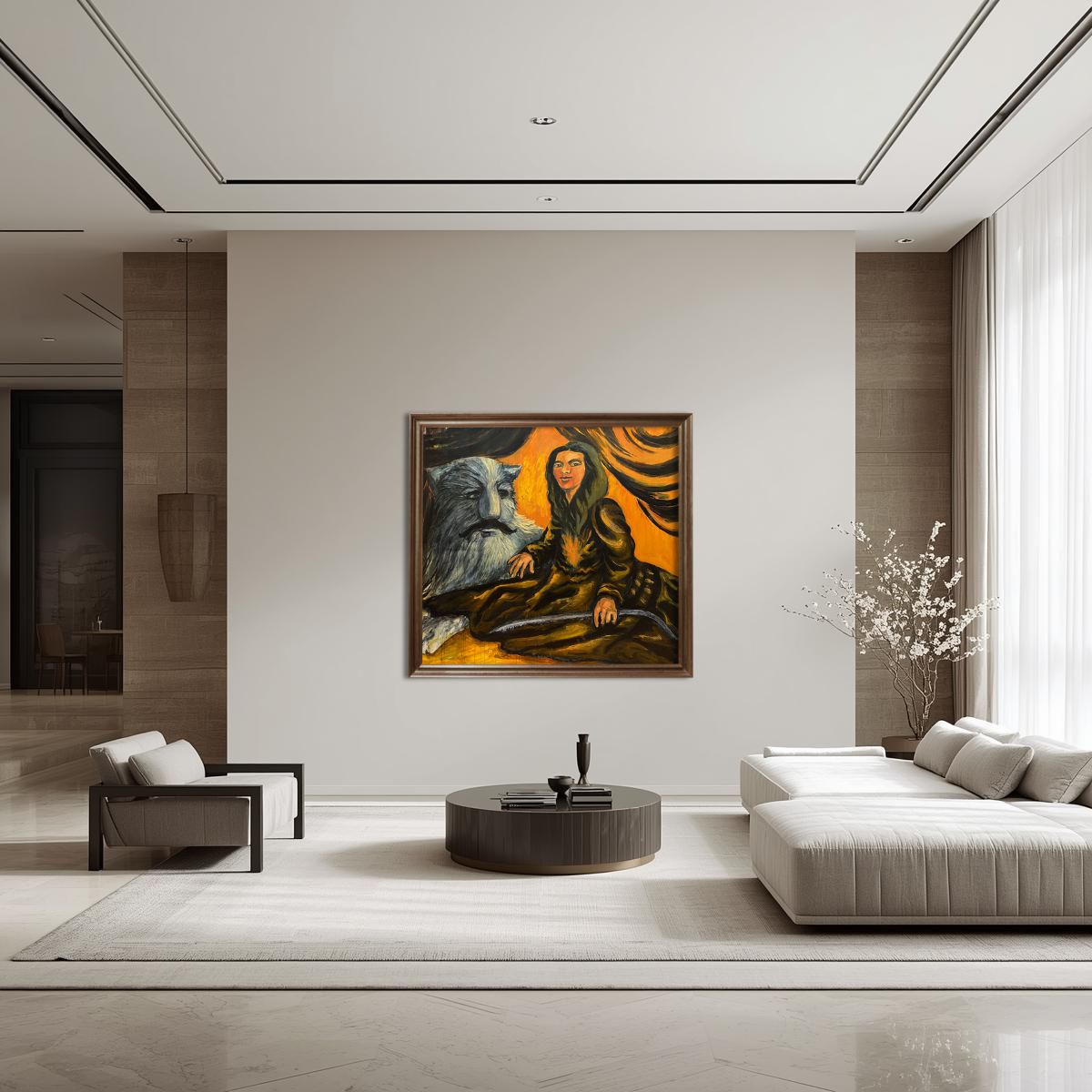 Obraz “Co-existence” podejmuje jeden z najstarszych i najbardziej fundamentalnych tematów w sztuce: relację człowieka ze światem zwierząt, a precyzyjniej – relację kobiety z “Bestią”. Jest to motyw o głębokich korzeniach kulturowych, badający dychotomię między cywilizacją a naturą, rozumem a instynktem, oraz pięknem a brzydotą.