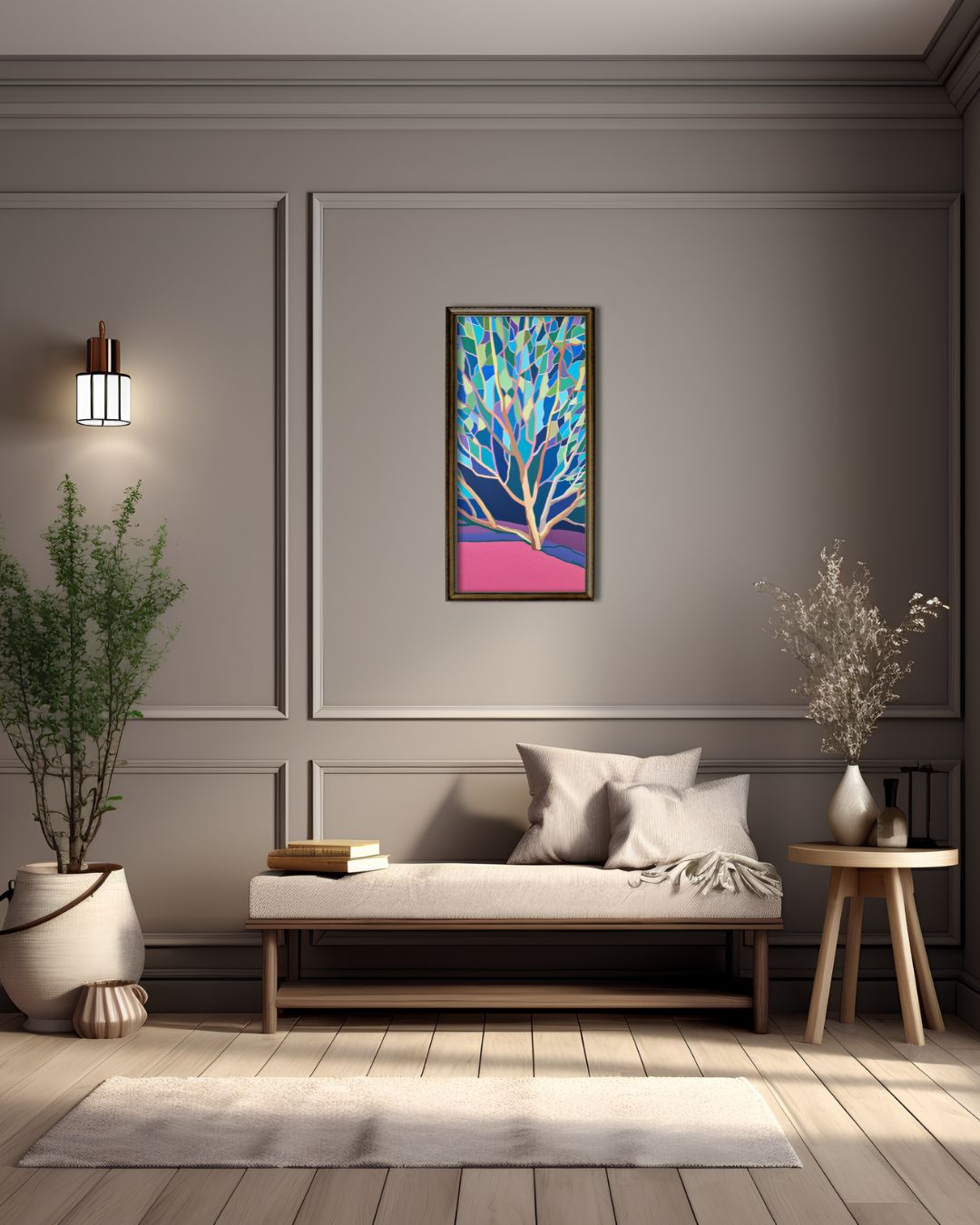 Obraz akrylowy Joanny Sułek-Malinowskiej, zatytułowany „Drzewko szczęścia”, to urzekający pejzaż przedstawiony w bliskim kadrze, który już na pierwszy rzut oka przyciąga bogactwem kolorystycznym i subtelnym, melancholijnym nastrojem.