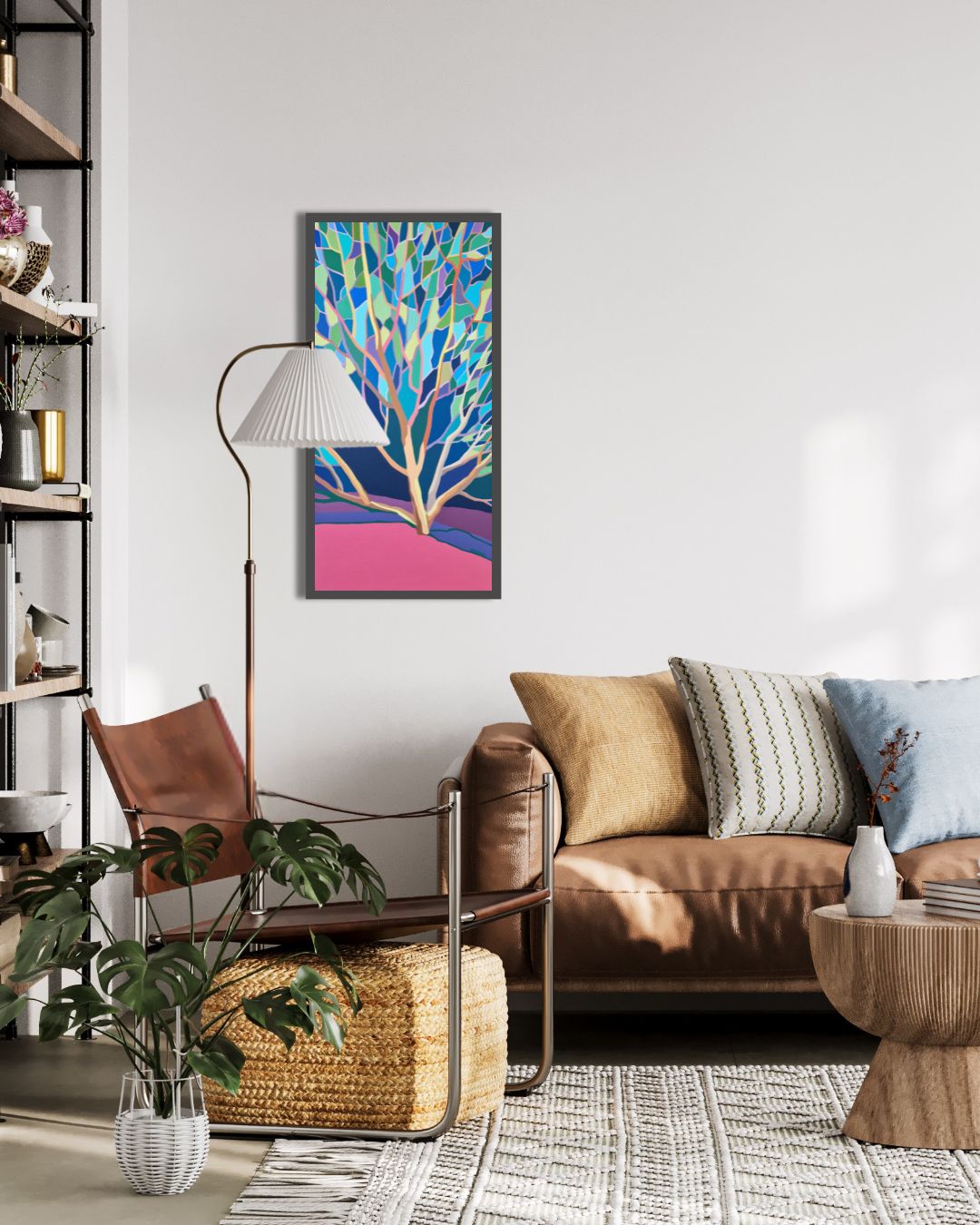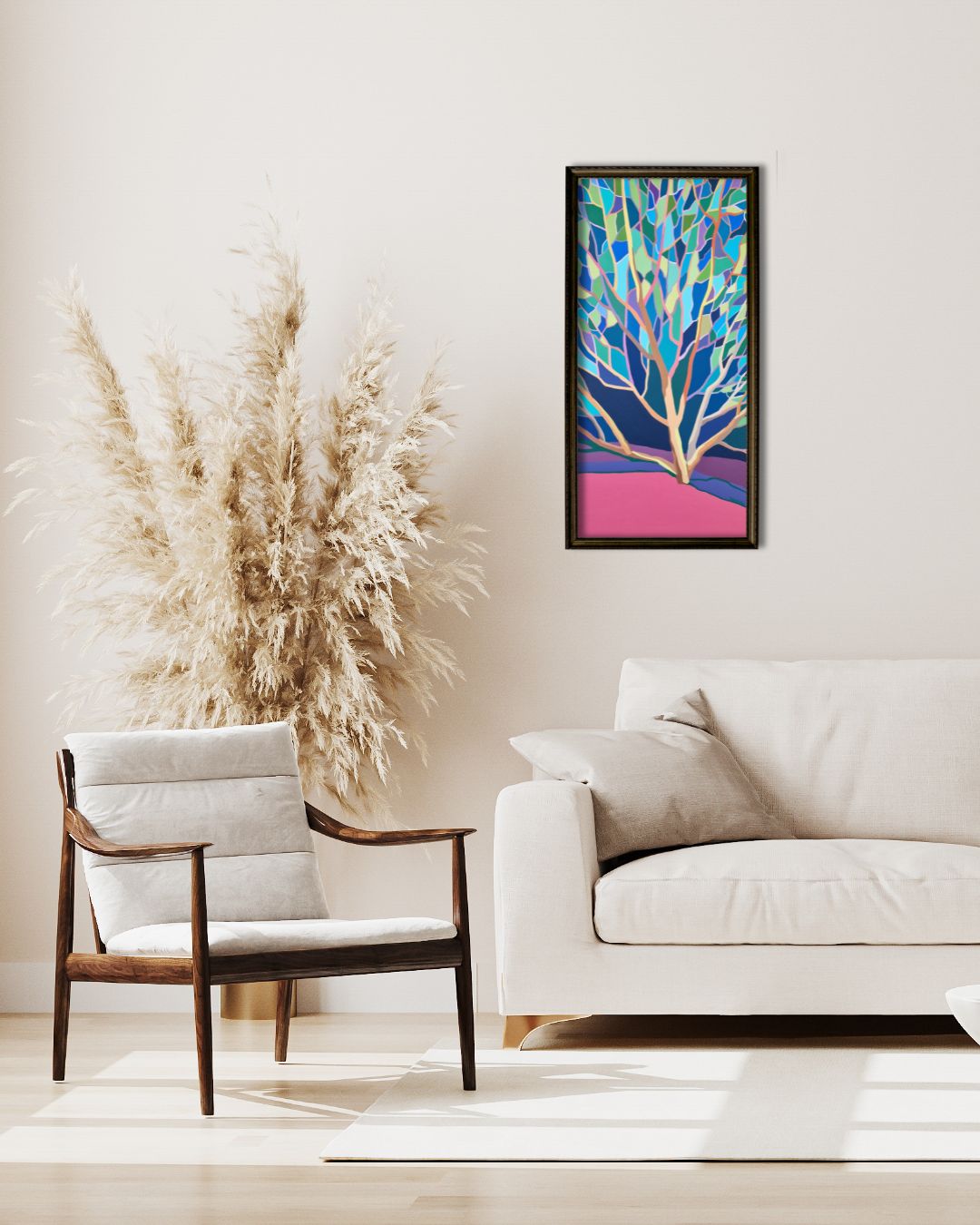 Patrząc na obraz, odbiorca może odczuć spokój, zadumę, a nawet nutę melancholii. Barwy nie krzyczą, lecz płyną, harmonijnie współgrając ze sobą i budując atmosferę kontemplacji. Chłodne odcienie niebieskiego i zieleni wprowadzają element spokoju i oddalenia, podczas gdy cieplejsze róże i brązy w pniu i ziemi dodają obrazowi delikatnego ciepła.