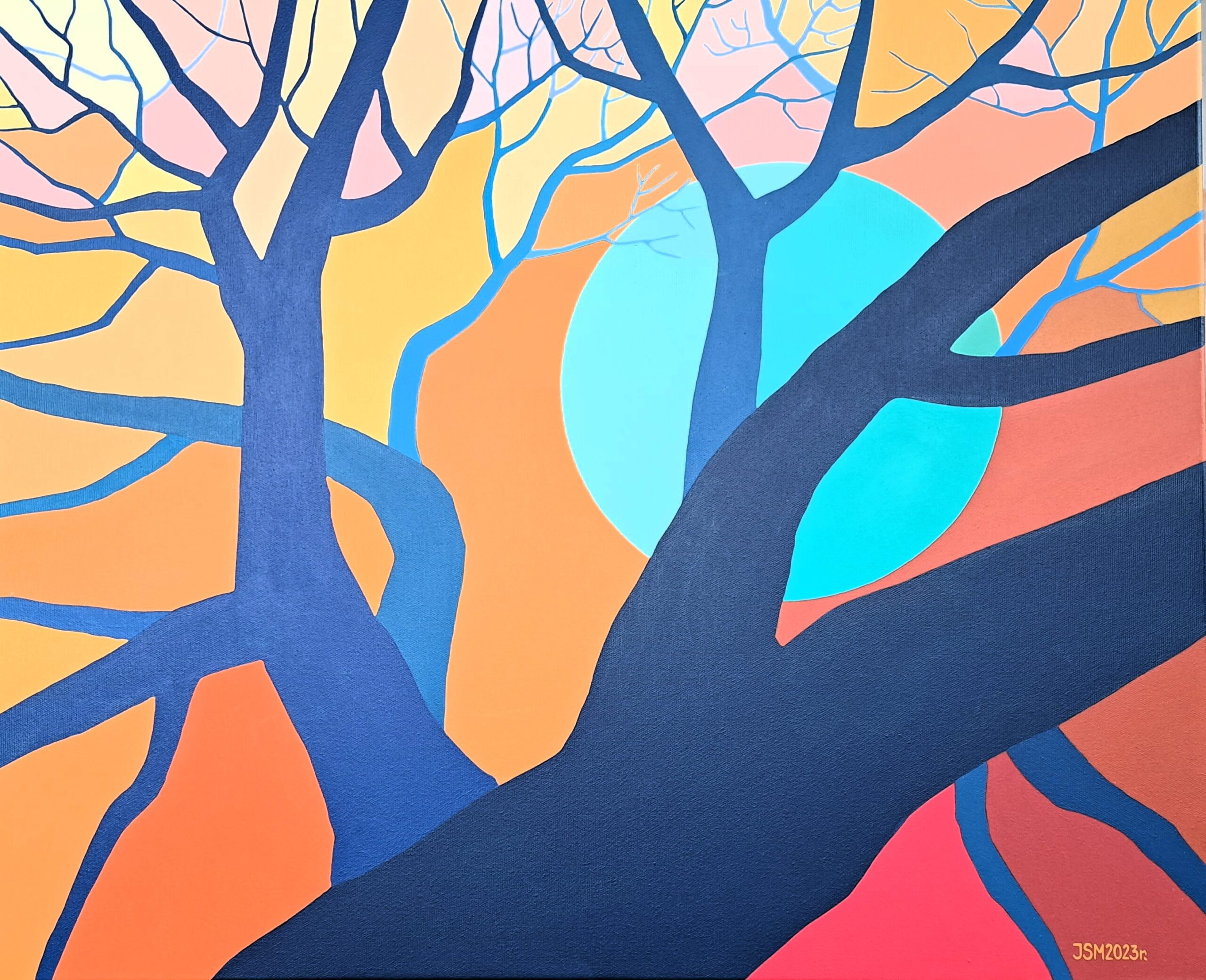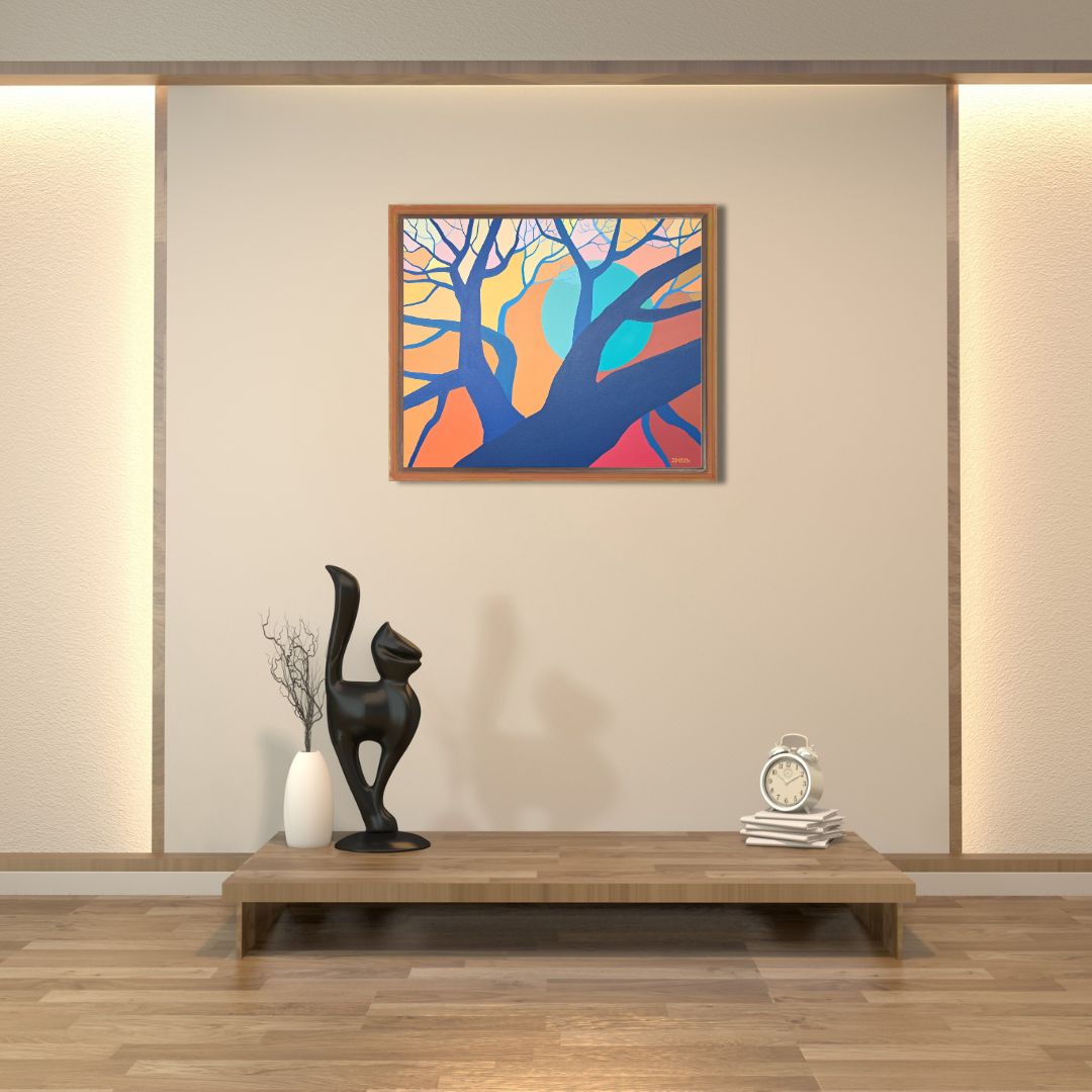 Dominującą rolę w obrazie odgrywa intensywna kolorystyka. Niebo, zamiast tradycyjnego błękitu, zostało ukazane w ciepłych, żółto-pomarańczowych tonacjach, co nadaje całości optymistyczny i radosny charakter. Słońce natomiast zostało przedstawione jako błękitna plama, kontrastująca z tłem. Ten niezwykły zabieg kolorystyczny podkreśla subiektywne doświadczenie artystki i jej wolność w interpretowaniu rzeczywistości. Pień i rozłożyste konary drzewa, malowane farbą w różnych odcieniach niebieskiego i granatu, dodają kompozycji głębi i dramatyzmu.