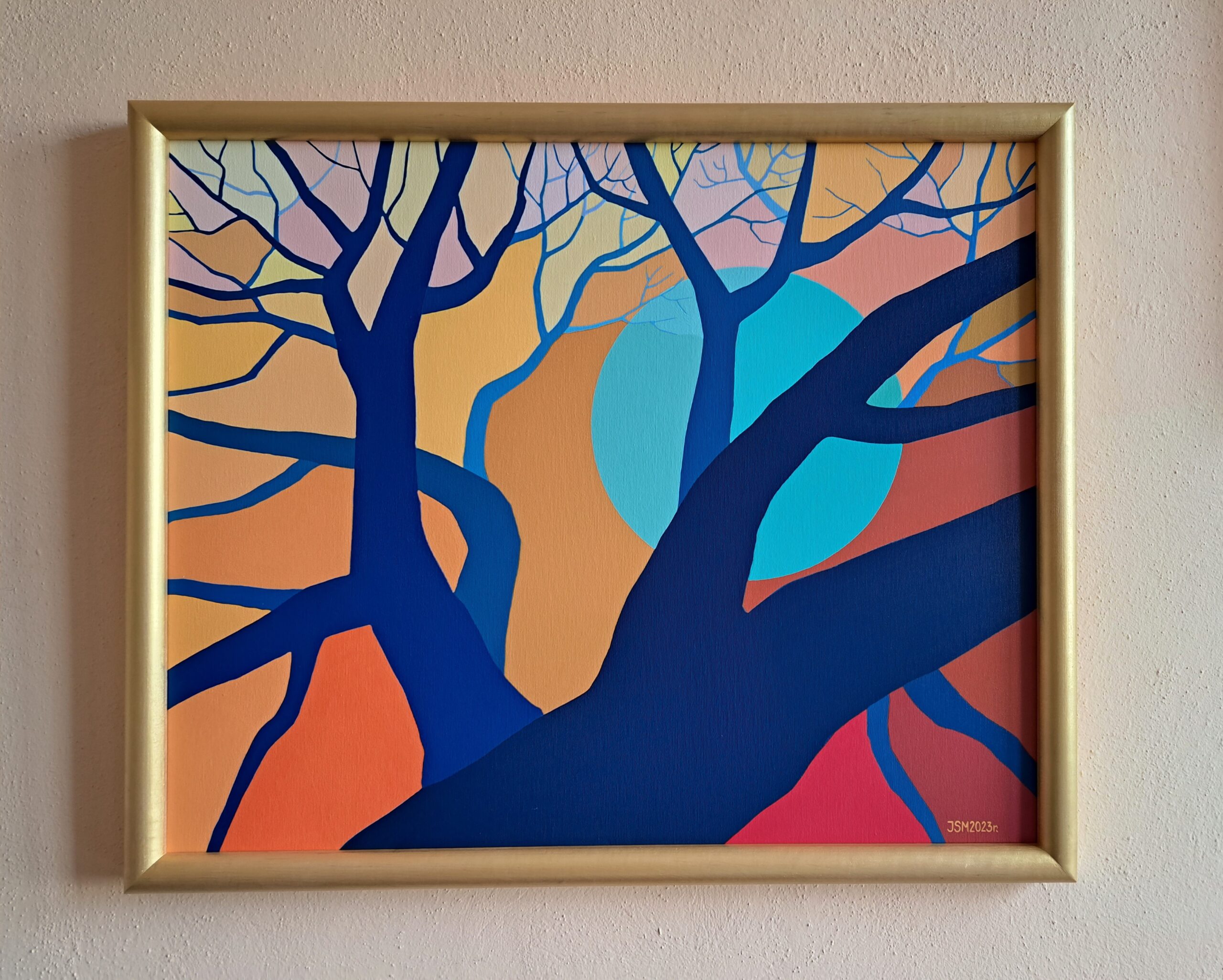 Płótno jest oprawione w drewnianą, wąska ramę pomalowaną na kolor złota oraz opisane; na froncie płótna (prawy, dolny róg) widnieją inicjały i rok powstania obrazu: JSM2021r.