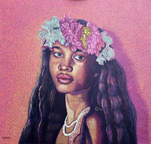 Prezentowany obraz to niezwykle subtelne i pełne poezji dzieło, które przenosi nas w świat kobiecej piękności i odrodzenia natury. Artystka, wykorzystując technikę akrylową, stworzyła portret kobiety, której twarz emanuje spokojem i tajemniczością. Otaczające ją tulipany w różnorodnych odcieniach różu i fioletu dodają kompozycji lekkości i świeżości, symbolizując przyrodę budzącą się do życia po zimowym śnie.