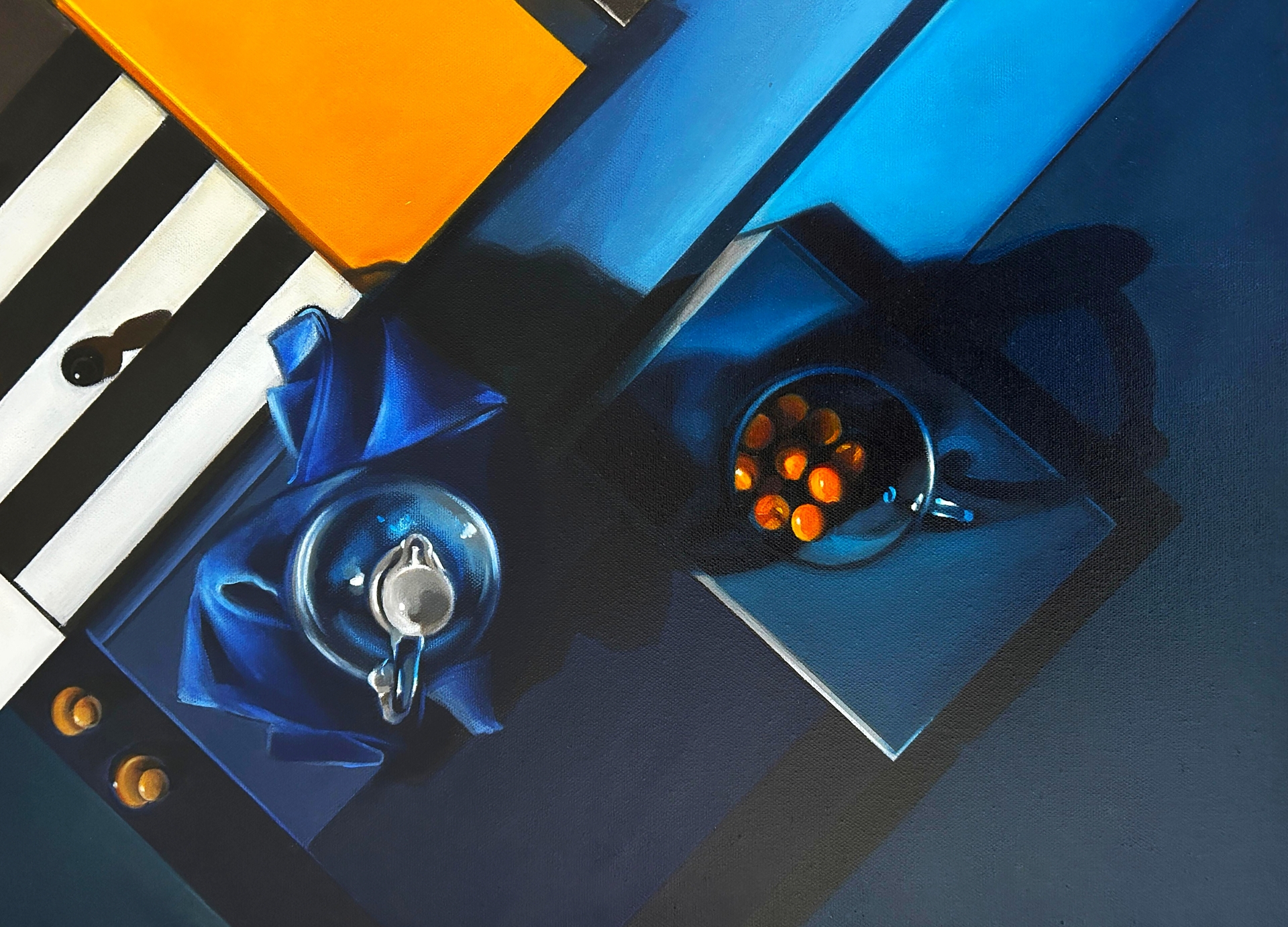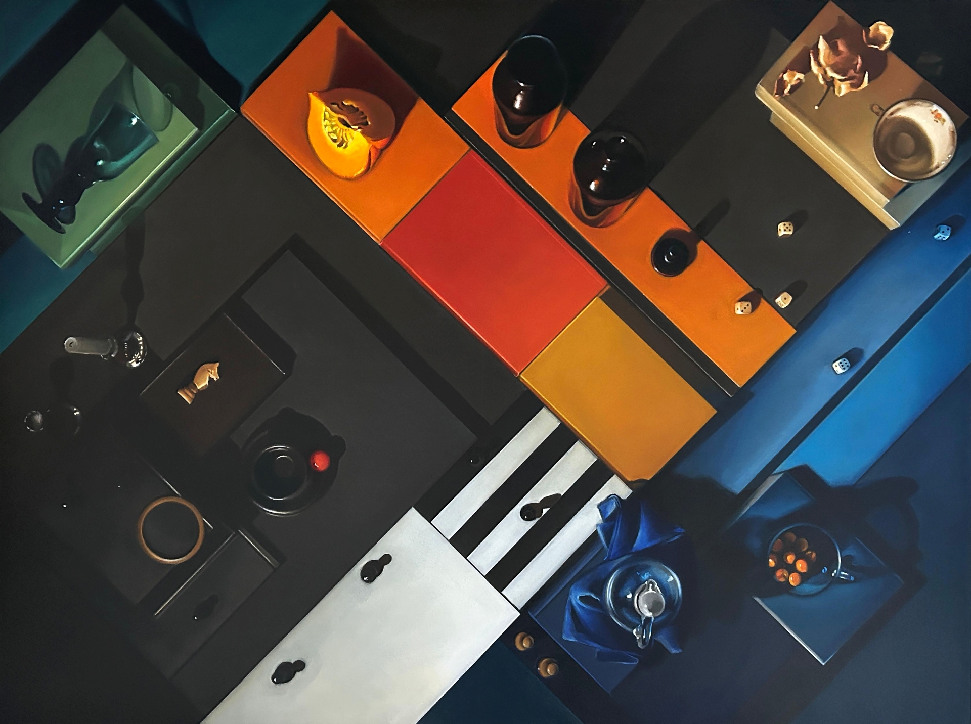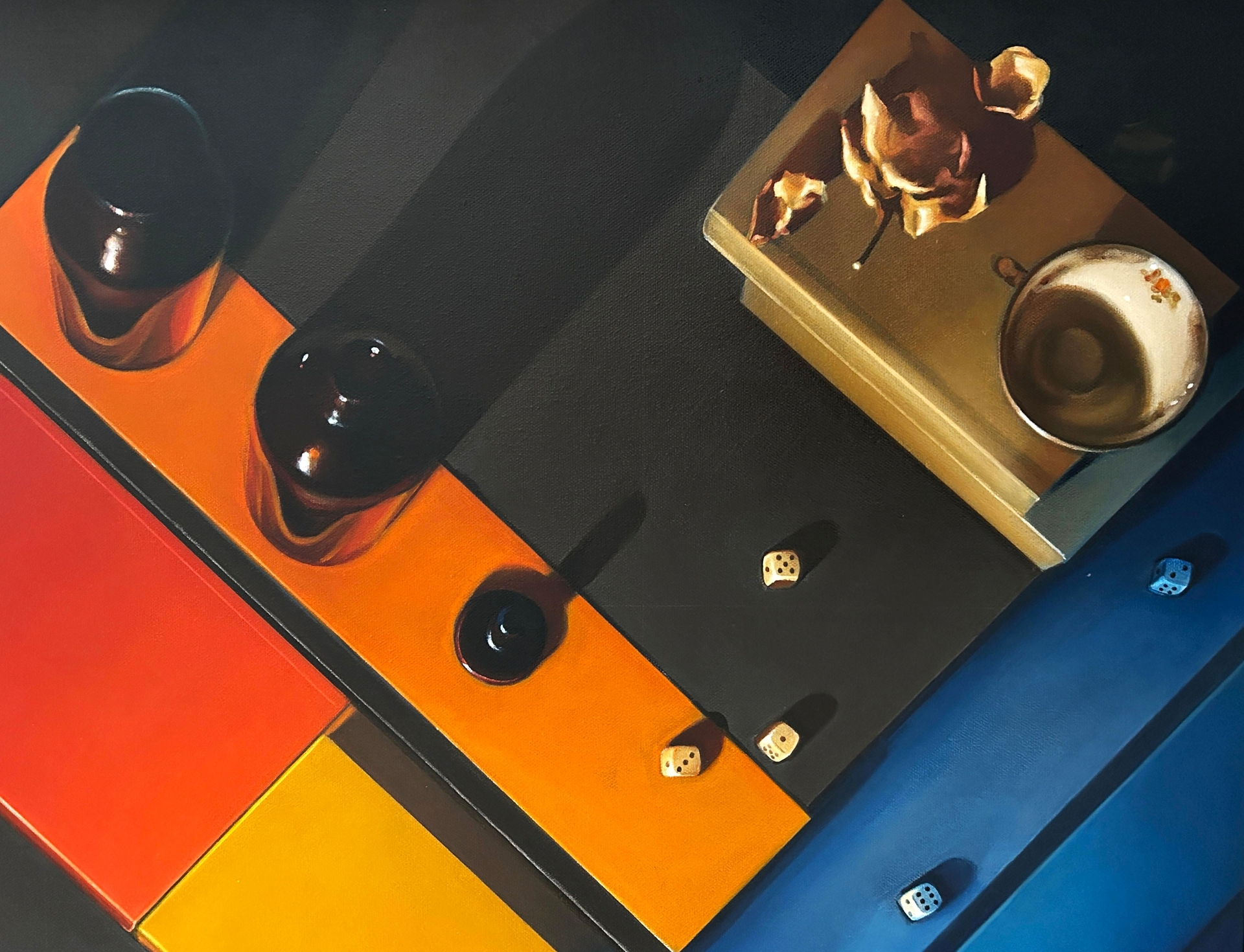 Ciekawa jest tu gra skali i ciężaru – drobne kości do gry rozrzucone na ciemnych pasach wydają się równie istotne co monumentalne płaszczyzny pomarańczu. To malarstwo „myślące”, które nie tylko cieszy oko bogactwem barw, ale zmusza do refleksji nad porządkiem świata i rolą przypadku (kości) versus strategii (szachy).