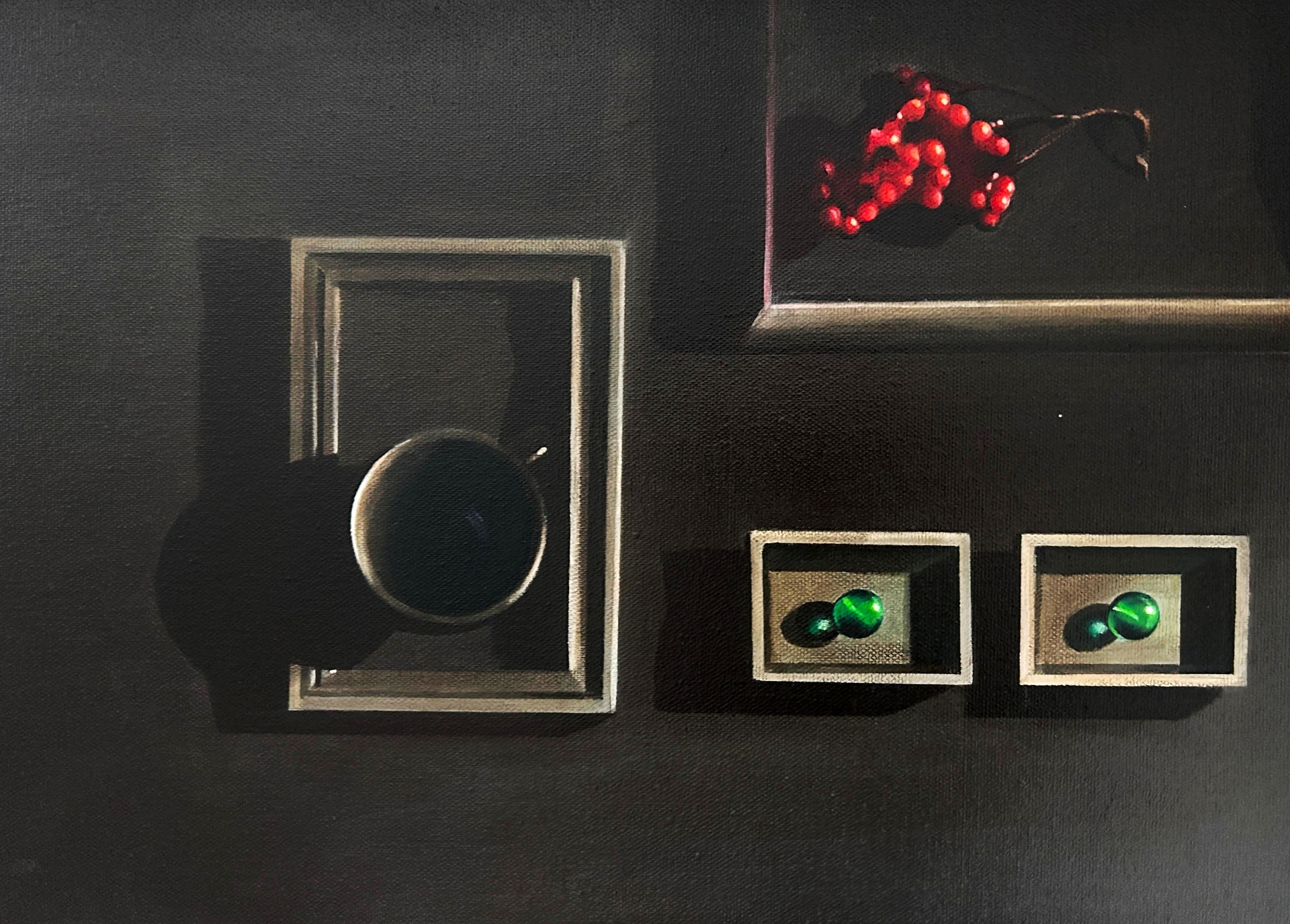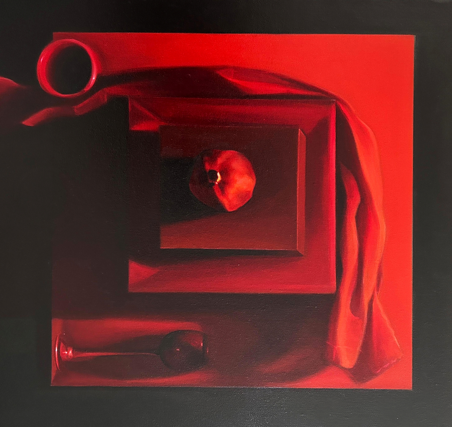W „Martwej naturze z granatem” Julia Marchlewska osiąga równowagę między malarską intuicją a matematyczną precyzją. Obraz ten można odczytywać jako hołd dla tradycyjnego kunsztu, podany jednak w formie nowoczesnego rebusu wizualnego. Artystka z niezwykłą swobodą operuje materią olejną, sprawiając, że namalowany owoc granatu zdaje się niemal emanować własnym, wewnętrznym żarem.