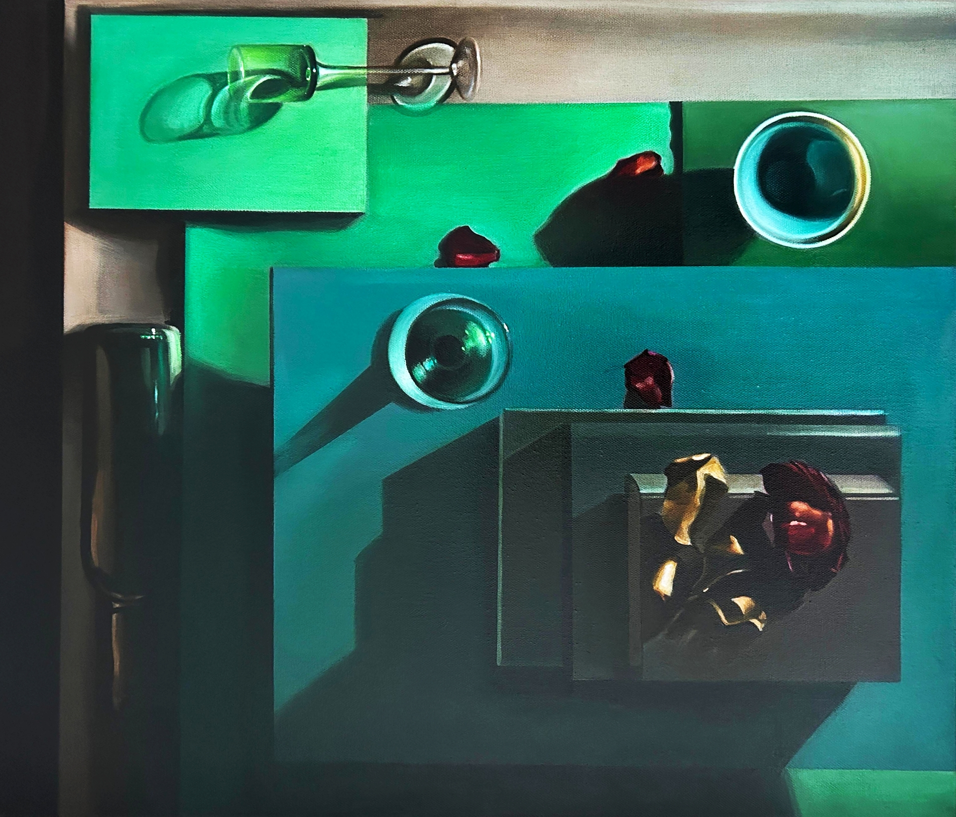 Współczesna martwa natura rezygnuje jednak z barokowego przepychu na rzecz rygoru kompozycyjnego. Przedmioty – kieliszki, filiżanki, sznurki korali – nie są już tylko elementami zastawy, lecz stają się czystymi formami geometrycznymi. Artystka, poprzez pieczołowite oddanie tekstury tkaniny czy lśnienia szkła, zaprasza widza do kontemplacji codzienności. Takie ujęcie tematu sprawia, że martwa natura staje się nowoczesnym studium porządku, w którym każdy element ma swoje precyzyjnie wyznaczone miejsce w barwnej architekturze płótna.