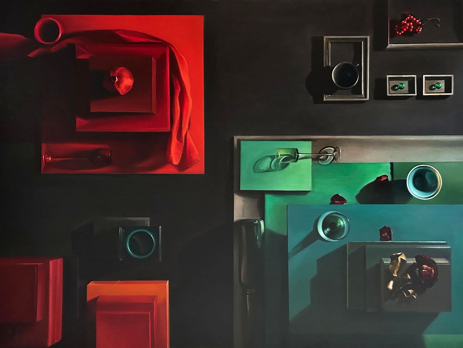 Warto zwrócić uwagę na grę skali i perspektywy. Kwadratowe podesty, na których spoczywają przedmioty, budują trójwymiarową głębię wewnątrz płaskich, geometrycznych pól. To malarstwo o wysokiej kulturze plastycznej, gdzie czerwień tkaniny nie jest tylko kolorem, ale staje się niemal fizycznym doświadczeniem miękkości. Marchlewska udowadnia, że martwa natura wciąż może być medium świeżym i intrygującym. To dzieło, które nie tylko dekoruje przestrzeń, ale zmusza do zatrzymania się nad precyzją świata rzeczy, czyniąc z prozaicznego zestawienia naczyń i owoców scenę o dużym ciężarze gatunkowym.