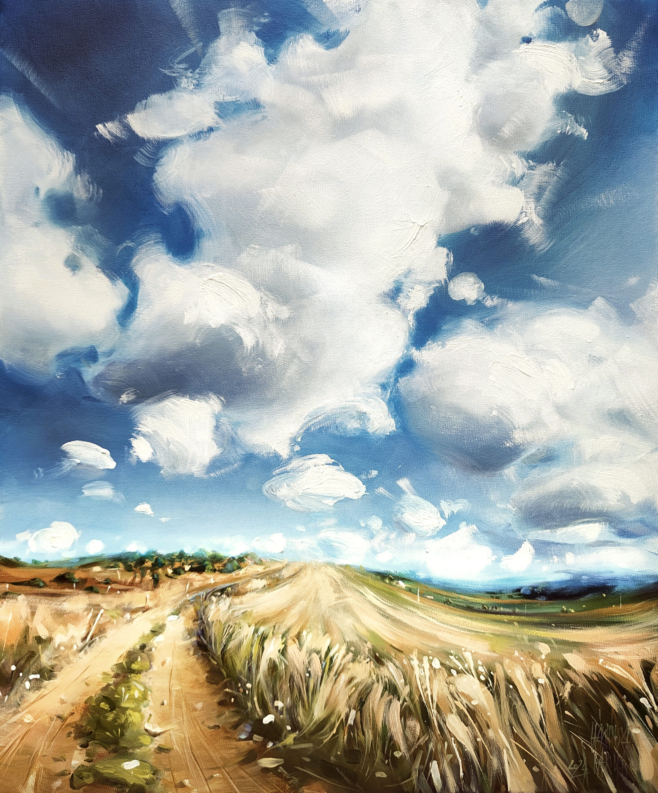 Wstęp: Obraz “Okrawek pola” autorstwa Kariny Jaźwińskiej to urzekające studium pejzażu, które z niezwykłą swobodą i ekspresją oddaje istotę polskiego krajobrazu. Dzieło to wyróżnia się wyjątkową malarskością, dynamiczną kompozycją i mistrzowskim operowaniem światłem, co czyni je nie tylko przedstawieniem natury, ale głębokim doznaniem wizualnym i emocjonalnym.