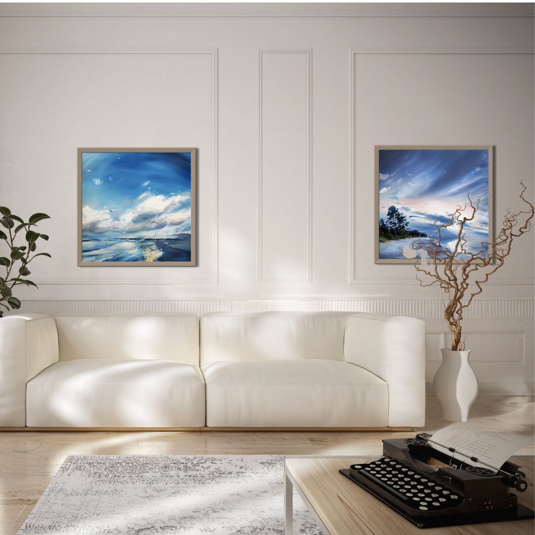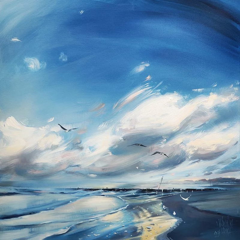 Szczególną uwagę zwraca mistrzowskie uchwycenie nieba. Jaźwińska z wirtuozerią oddaje zmienność i dynamikę chmur, ich kształty i kolory. Błękity, szarości i biele przenikają się, tworząc wrażenie głębi i przestrzeni. Niebo odbija się w tafli morza, potęgując wrażenie iluzoryczności i piękna natury. Artystka zdaje się prowadzić dialog z niebem i morzem, a my jesteśmy świadkami tego fascynującego spotkania.