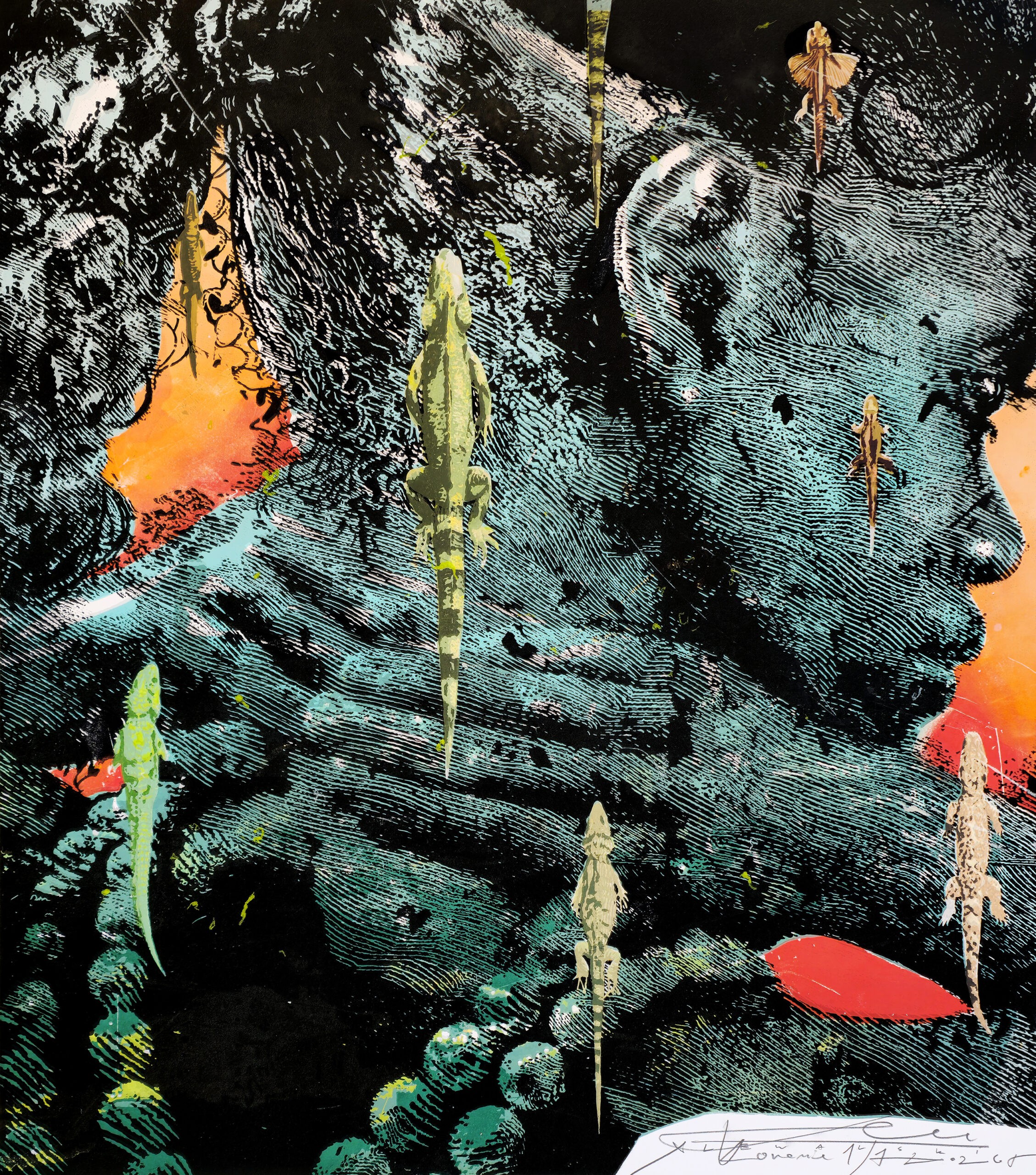 Tło pracy, pulsujące gorącymi żółcieniami i czerwieniami, przywołuje na myśl wyobrażenie afrykańskiego słońca – wschodu lub zachodu, który jest jednocześnie końcem i początkiem cyklu. W tę metafizyczną przestrzeń Lewalski wplata jaszczurki. Nie są one tu przypadkowym elementem zdobniczym, lecz dopełnieniem biologicznego rytmu. Rozrzucone po kompozycji, łączą postać kobiety z ziemią i naturą przodków, podkreślając, że ludzkie „korzenie” są nierozerwalnie splecione z biosferą. Artysta, wykorzystując trudną i rygorystyczną technikę linorytu traconego, tworzy dzieło o niezwykłej sile wyrazu – surowe w formie, a jednocześnie nasycone duchowością i nostalgią za krainą początków.