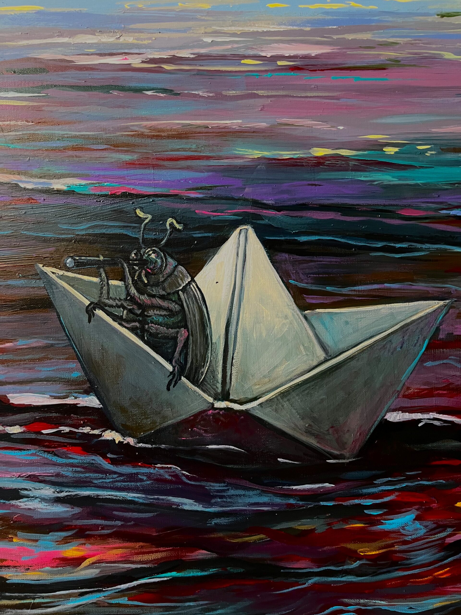 Obraz staje się portretem nie tyle podróży, ile fundamentalnej samotności. Krucha, papierowa łódeczka podkreśla znikomą odporność jednostki rzuconej na wzburzone, nienaturalnie kolorowe morze współczesności. Krajobraz, mieniący się pięknymi, neonowymi barwami, przypomina estetykę wirtualnego świata mediów społecznościowych – świata, który wibruje kolorami, ale w swej istocie jest bezkresny, pusty i zimny. Owad-człowiek samotnie dryfuje ku niewiadomej, „gdzieś na końcu wody”, stając się przejmującym symbolem jednostki w poszukiwaniu sensu w olśniewającej, lecz izolującej rzeczywistości.