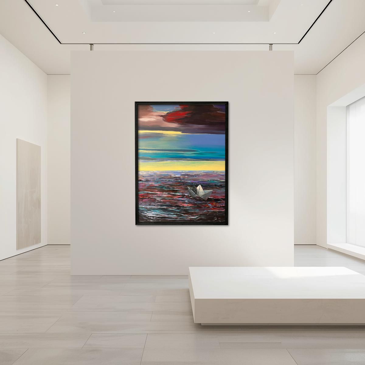 Mamy przed sobą pejzaż marynistyczny, który zamiast romantycznego spokoju oferuje niepokojący dysonans. Kompozycja jest wyraźnie podzielona. Niebo to arena zmagań ciemnych chmur z nienaturalnymi, pasami ostrego światła – syntetycznej żółcieni i turkusu. Morze, dalekie od realizmu, jest wzburzoną, migotliwą taflą, która odbija zarówno mrok chmur, jak i neonowe barwy horyzontu. W tym przytłaczającym, nieludzkim bezkresie artystka umieszcza pojedynczego bohatera – owada w kruchej, papierowej łódce.