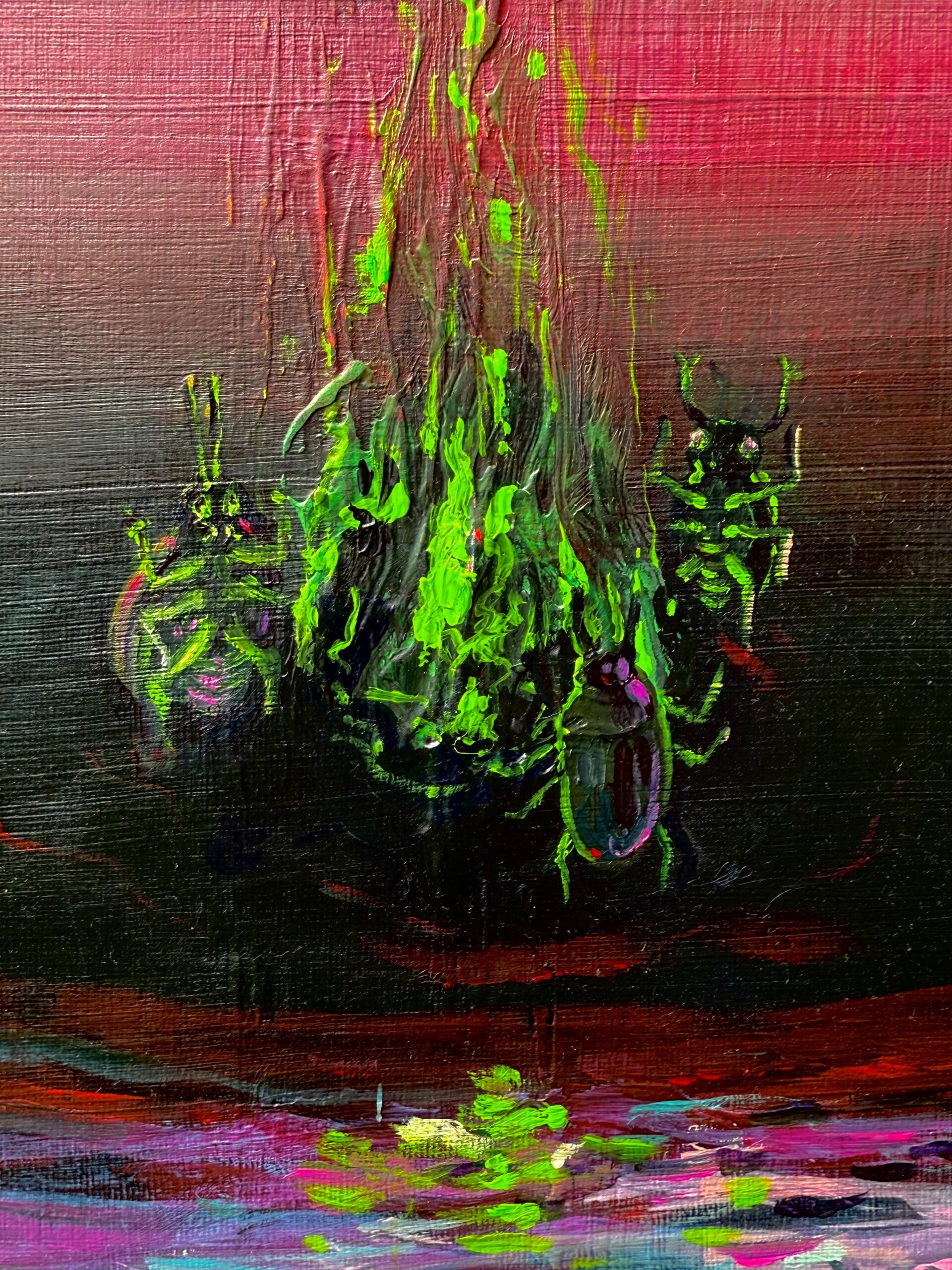 Jednocześnie, wprowadzając do tej pozornie realistycznej scenerii elementy nierzeczywiste (owady tańczące w neonowym deszczu), Bąkowska-Roszkowska przenosi pejzaż w domenę surrealizmu. Krajobraz staje się przestrzenią oniryczną, snem, w którym, jak w pracach Maxa Ernsta, spotykają się porządki niemożliwe do pogodzenia w realnym świecie. W tym ujęciu, pejzaż nie jest zapisem realnej topografii, lecz mentalnym teatrem, w którym artystka bada fundamentalne dla swojej twórczości napięcie między tym, co postrzegamy jako piękne (nastrojowy zachód słońca) a tym, co budzi niepokój lub jest odpychające (obce, nierzeczywiste formy).