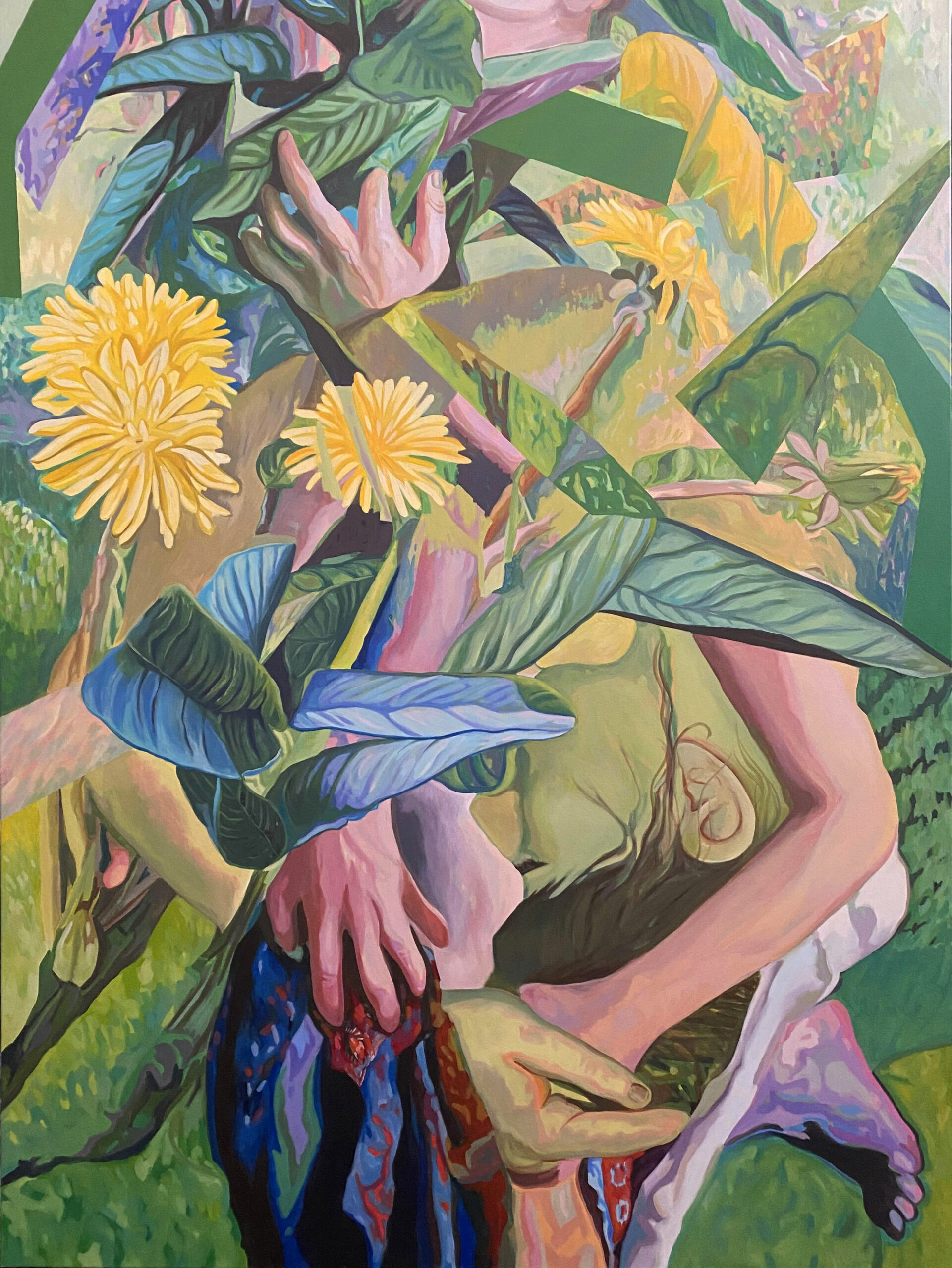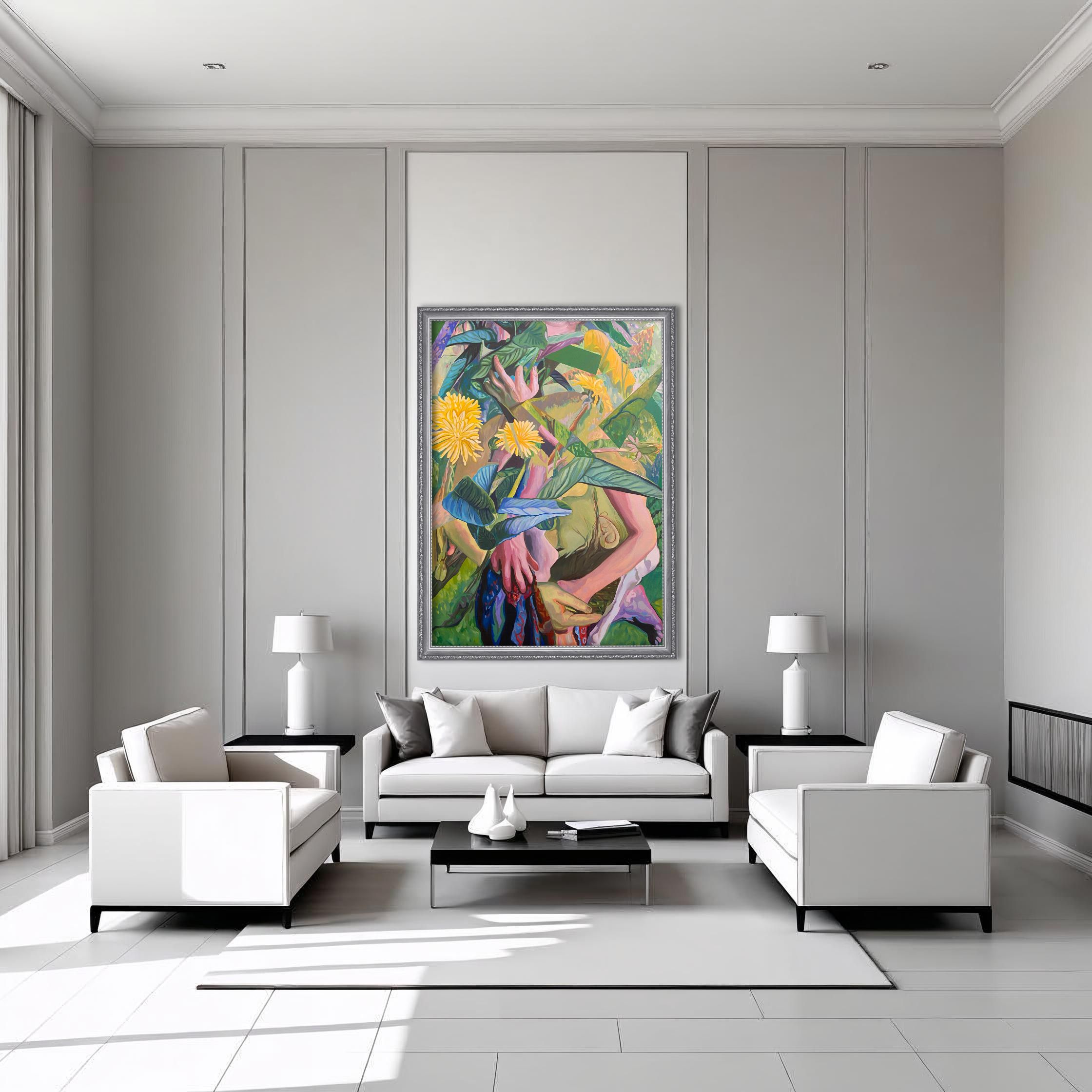 Kompozycja obrazu jest gęsta i  dynamiczna. Fragmentaryczne postacie ludzkie spleciono w niej z bujną, choć silnie stylizowaną i abstrakcyjną roślinnością. Obraz operuje na pograniczu figuracji i abstrakcji, tworząc wrażenie organicznej całości. Widoczne są dłonie, fragmenty ramion i nóg, a także subtelne zarysy twarzy, które są jednak rozproszone i wtopione w gęstwinę liści i geometrycznych form. Centralną uwagę przykuwają duże, stylizowane żółte kwiaty, które stanowią silny akcent kolorystyczny i nadają kompozycji pewien rytm.