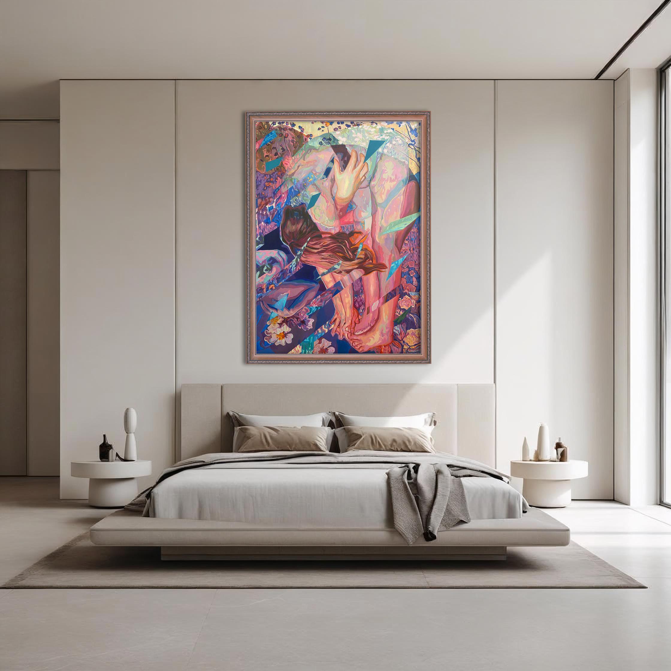 Wstęp: Obraz „Entropia IV” autorstwa Katarzyny Jakubowskiej, wykonany techniką oleju na płótnie w 2020 roku, stanowi kolejny, intrygujący element w jej kluczowym cyklu „Entropie”. Podobnie jak poprzednie prace z tej serii, „Entropia IV” jest pogłębioną wizualną interpretacją pojęć bezładu i chaosu, które dla artystki stanowią punkt wyjścia do artystycznych poszukiwań. Tytułowa entropia, rozumiana jako miara nieuporządkowania w układzie, jest w tym dziele oswajana i przekształcana poprzez proces malarski, odbywający się w ciszy pracowni. Obraz zaprasza widza do wejścia w świat rozbitych form i przenikających się barw, oferując jednocześnie momenty intymnej refleksji.