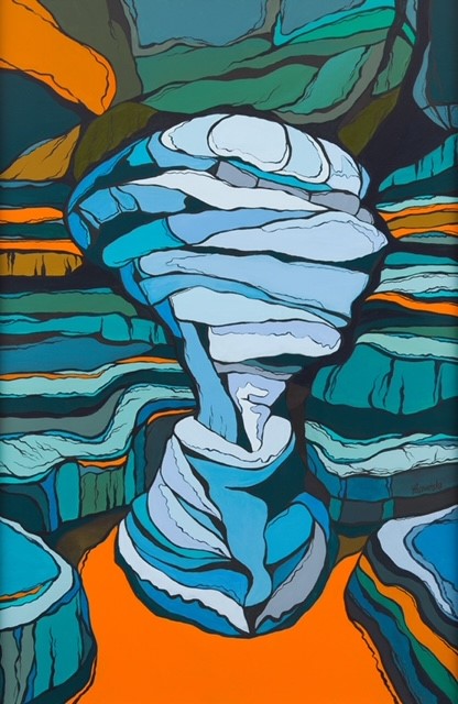 Jest to kolejny po Synestezji wrażeń (zobacz obraz i jego opis tutaj) psychologiczny, wewnętrzny pejzaż. Umieszczona w centrum kadru biomorficzna formacja przypomina ludzką głowę, lub popiersie opływane ze wszystkich stron falami warstw geologicznych. To alegoryczne odniesienie do sytuacji jednostki we współczesnym świecie, gdzie jesteśmy poddawani ciągle naporowi nowych, bez końca płynących informacji i często sprzecznych ze sobą treści. W wyniku tych interferencji powstają złudzenia rzeczywistości rodem ze świata social mediów, wypierające realne doznania i doświadczenia.