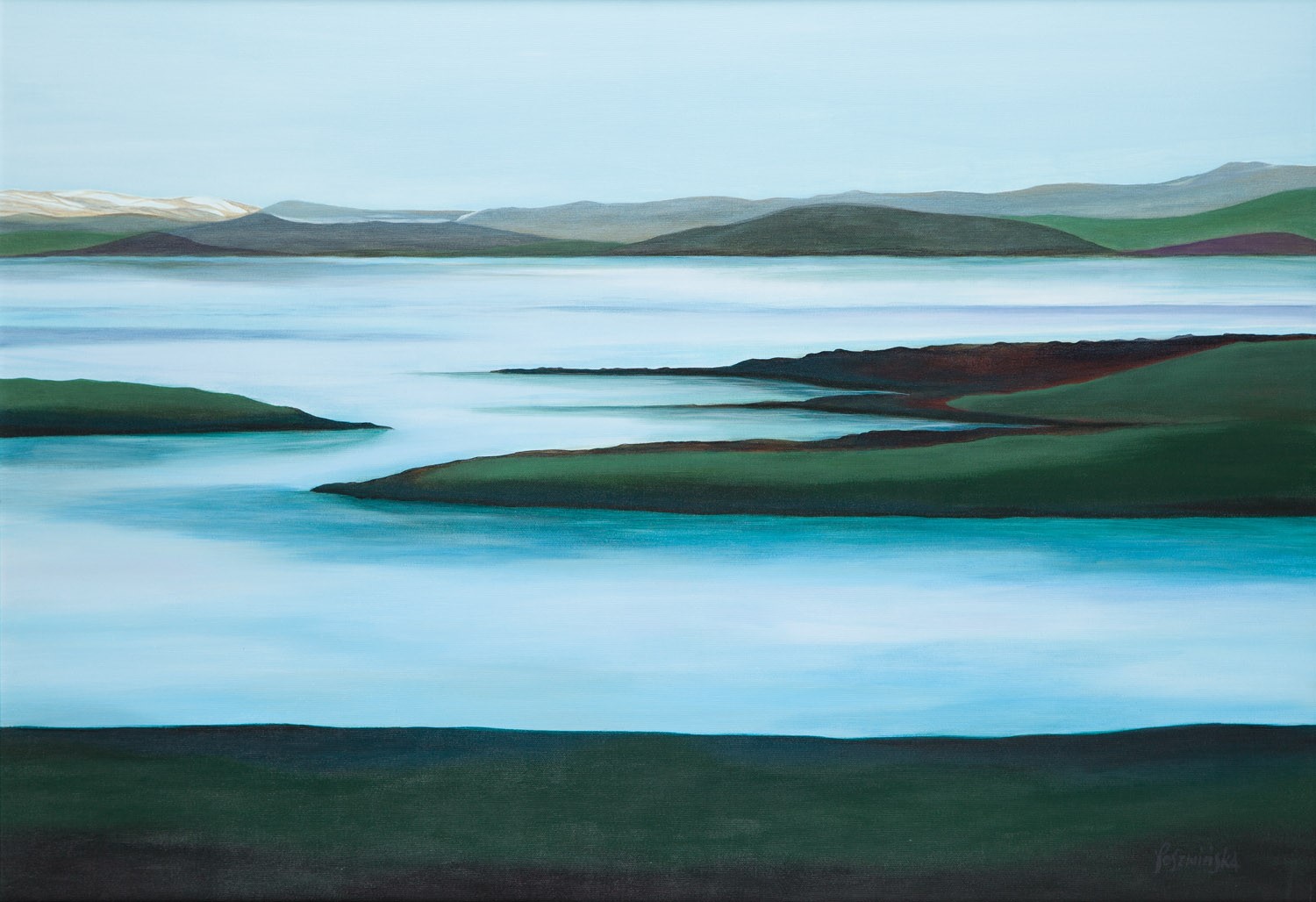 Przedstawiony obraz to malarska impresja, która przenosi nas w serce surowej, północnej przyrody. Artystka, mistrzowsko posługując się paletą barw i prostotą form, stworzyła dzieło emanujące spokojem i melancholią.