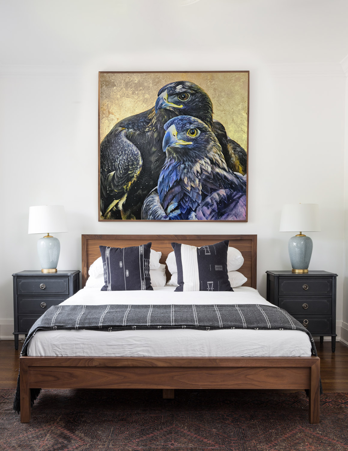 Warsztat Hladki imponuje tu precyzją w operowaniu fakturą. Pióra ptaków nie są czarne – mienią się błękitem, fioletem i ochrą, co świadczy o dużej wrażliwości artystki na niuanse barwne i fizykę światła. Charakterystyczny dla autorki zabieg „prószenia” białą farbą tym razem przypomina gwiezdny pył lub drobinki lodu, co jeszcze bardziej odrealnia scenę, nadając jej charakteru wizyjnego. Bliskość obu ptaków sugeruje więź, partnerstwo i wspólną siłę, co nadaje obrazowi wymiar emocjonalny. „Rulers of the sky” to praca, która zachęca do refleksji nad majestatem natury, podnosząc wizerunek orła do rangi współczesnego symbolu niezależności i duchowej potęgi.