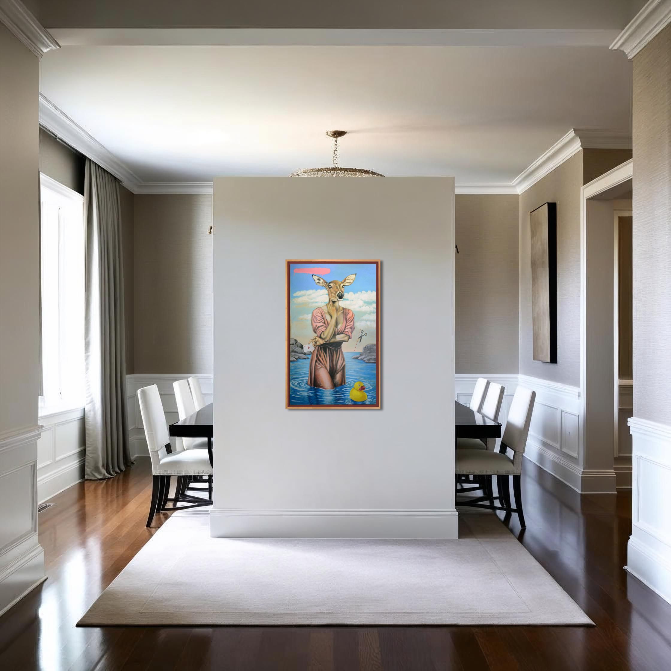 Podsumowanie: Obraz jest wyrazistym przykładem unikalnego stylu artysty i jego fascynacji surrealistycznymi hybrydami. Poprzez połączenie realistycznego przedstawienia z nielogicznymi zestawieniami i symbolicznymi elementami, artysta tworzy dzieło, które prowokuje do myślenia i interpretacji. Zestawienie sarniej głowy z ludzkim ciałem i umieszczenie jest w na poły surrealistycznym otoczeniu rodzi pytania o naturę tożsamości, relację człowieka z naturą i rolę losu w naszym życiu. „As” to nie tylko intrygujący obraz, ale także wizytówka artysty, którego twórczość na trwale wpisała się w pejzaż współczesnego polskiego malarstwa. Jego charakterystyczne hybrydy stanowią fascynujące i niepokojące studium ludzkiej kondycji w zwierzęcym kostiumie.