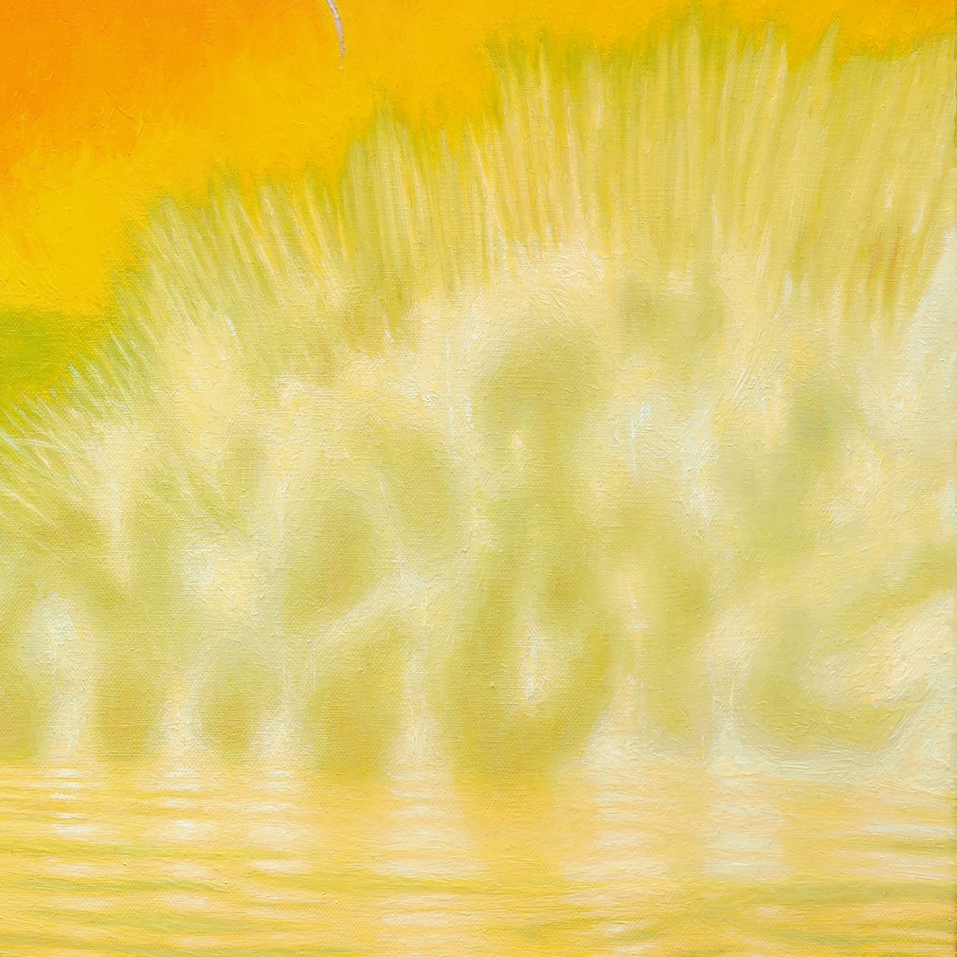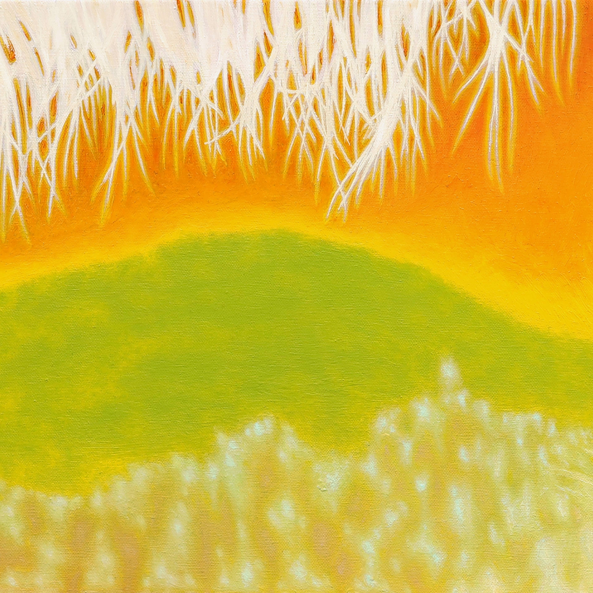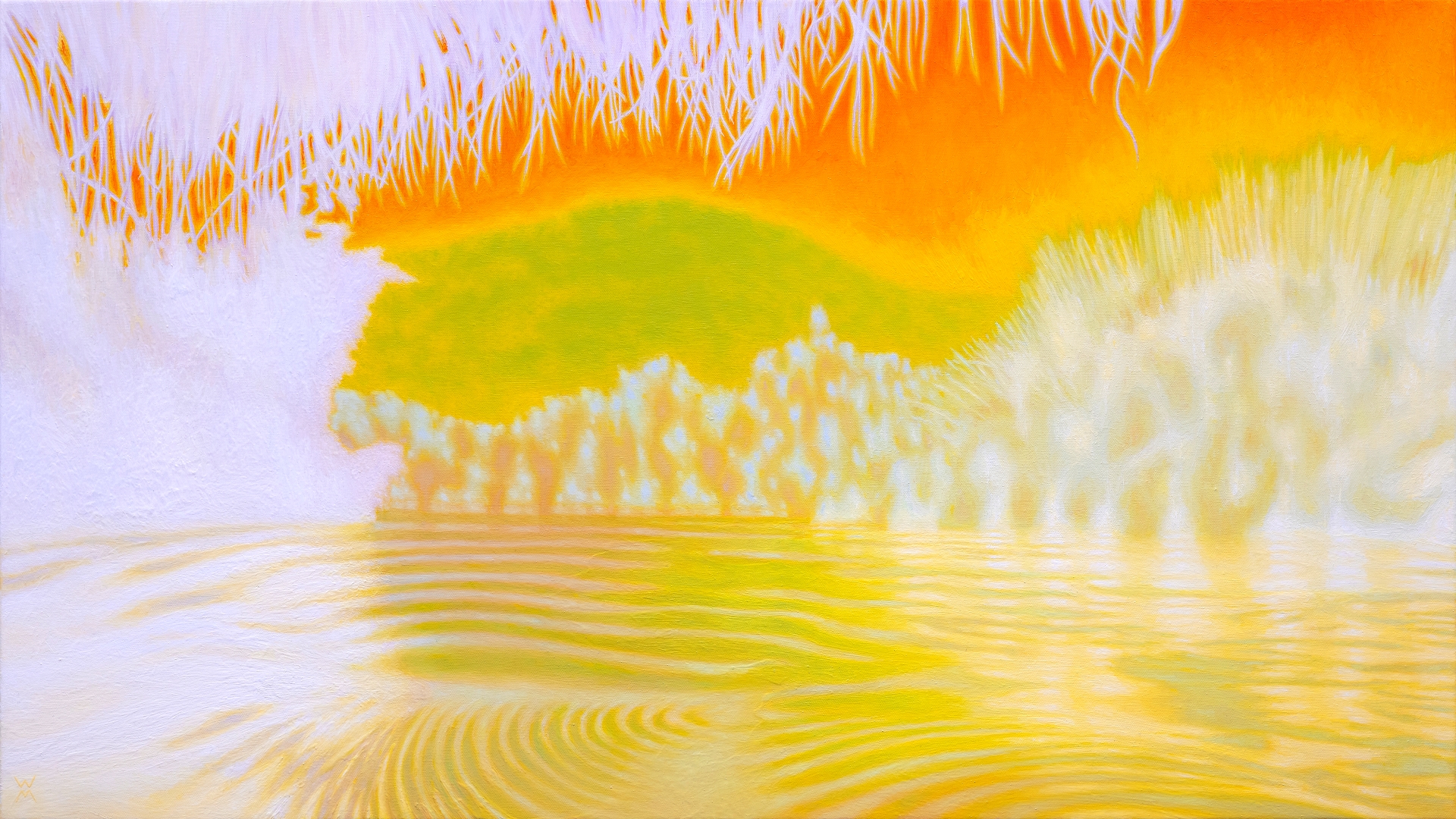 1. PALETA ORAZU opiera się na wysokim nasyceniu i luminancji, budując iluzję oślepiającego światła poprzez zestawienie barw ciepłych z niemal czystą bielą, 2. DOMINANTA SOLARYCZNEGO POMARAŃCZU – jaskrawy, fluorescencyjny odcień w górnej partii płótna promieniuje energią, wywołując u widza fizyczne odczucie żaru, 3. ŚWIETLISTA BIEL I RÓŻ – rozproszone plamy tych kolorów imitują zjawisko prześwietlenia (solaryzacji), tworząc wibrację na styku z ciepłymi tonami, co optycznie „oślepia” odbiorcę, 4. LIMONKOWA ZIELEŃ I ŻÓŁCIEŃ – pasy roślinności w środkowym planie wprowadzają świeżość i organiczny rytm, 5. OCHRA I ZŁOCISTE REFLEKSY – dolna partia obrazu, przedstawiająca rzekę, wykorzystuje złamane żółcienie i brązy do oddania głębi wody oraz rytmicznych fal.